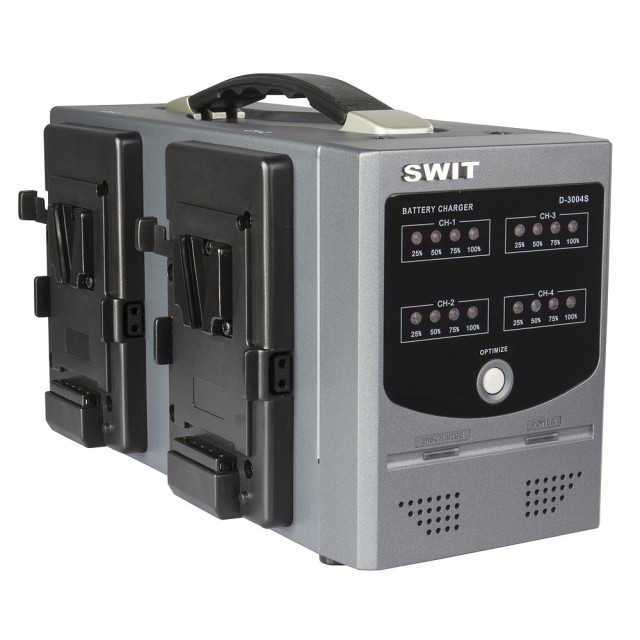 SWIT PC-P430S je potpuno istovremeni 4-kanalni V-mount punjač baterija s LED indikatorom statusa napunjenosti pojedinačnih baterija. Punjač PC-P430S ima 2 x 4-pinska XLR izlaza napajanja.