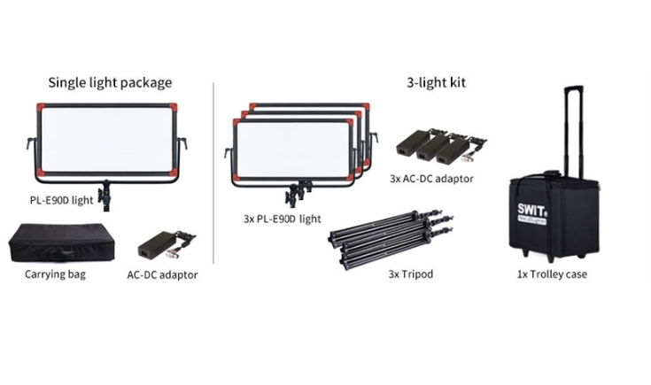 SWIT PL-E90D 3KIT je profesionalno prijenosno rješenje za rasvjetu na terenu dizajnirano za emitiranje, dokumentarne programe, intervjue i studijske primjene. Svaki PL-E90D LED panel koristi 480 SMD LED dioda montiranih na rubu u kombinaciji s jedinstvenom SWIT-ovom tehnologijom svjetlosnog vodiča od 90°, stvarajući iznimno mekan, svijetao i ravnomjerno raspoređen svjetlosni izlaz uz održavanje tankog i laganog oblika.
