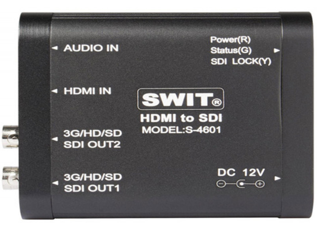 SWIT S-4601 je prijenosni, robusni HDMI-3G/HD/SD-SDI pretvarač s jednim HDMI ulazom i dvostrukim SDI izlazima. Podržava ugrađeni HDMI audio kao i vanjski analogni audio putem 3,5 mm ulaza, oboje integrirano u SDI izlaz. Smješten u robusnom metalnom kućištu s donjim navojnim otvorima za sigurnu instalaciju, idealno je rješenje za profesionalno emitiranje, produkciju uživo i AV radne procese.