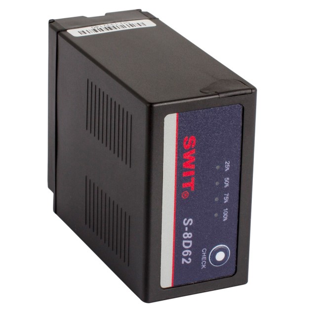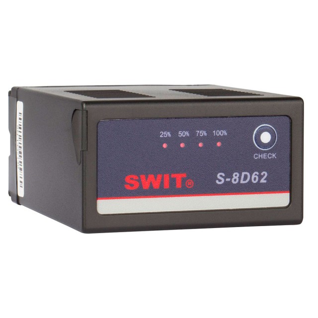 SWIT S-8D62 je Panasonic CGA kompatibilna punjiva Li-Ion 7.2V baterija s kapacitetom od 47Wh i 6.6Ah, 4-LED indikacijom statusa, 7.2V DC izlazom i višestrukim zaštitnim krugovima.