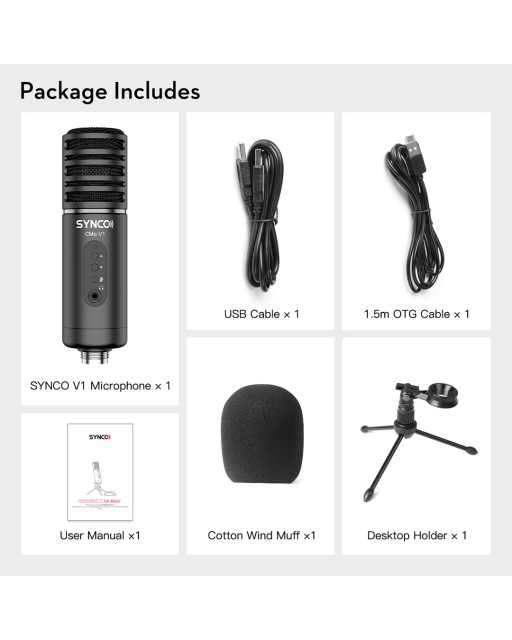 CMic-V1 je prvi Syncov elektret mikrofon s velikom dijafragmom i USB napajanjem/izlazom. Nudi širok, uravnotežen frekvencijski odziv u pojasu 20 Hz-20 kHz i briljantan zvuk za univerzalnu upotrebu u kućnim studijima, live streaming itd. Integrirana elektronika omogućuje USB izlaz, mogućnost slušanja sa slušalicama (3,5 mm utičnica ) i funkcija za kontrolu pojačanja i isključivanja zvuka dostupna putem integriranih gumba. U paketu dolazi i stolni stalak...