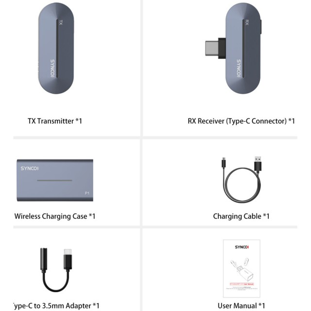 Synco P1 je serija bežičnih mikrofona za iPhone (model P1L s Lightning konektorom) ili Android telefoni (model P1T s USB-C konektorom). P1 komplet uključuje bežični odašiljač s ugrađenim mikrofonom, prijemnik koji se može montirati na uređaj i prijenosnu kutiju za punjenje. Prijemnik se postavlja izravno u telefonski priključak i omogućuje digitalnu vezu izravno s uređajem. Odašiljač veličine slušalice pričvršćuje se izravno na prevoditelja.