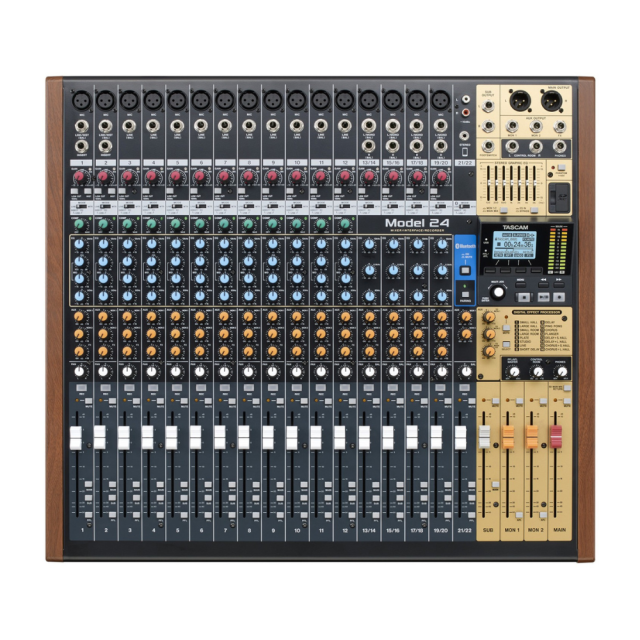 Uz mikrofonska pretpojačala studijske kvalitete i moćne mogućnosti EQ-a i usmjeravanja, Model 24 ima namjenski 1/8" stereo kanal, dva RCA i Bluetooth™ povezivost. To korisnicima omogućuje jednostavnu integraciju mobilnih uređaja u miks za reprodukciju na probi , glazba u pokretu i još mnogo toga. Posljednje, ali ne najmanje važno, TASCAM Model 24 također može funkcionirati kao moćno audio sučelje i povezuje se izravno na PC ili Mac radi jednostavne integracije s vašim DAW-om po izboru.
