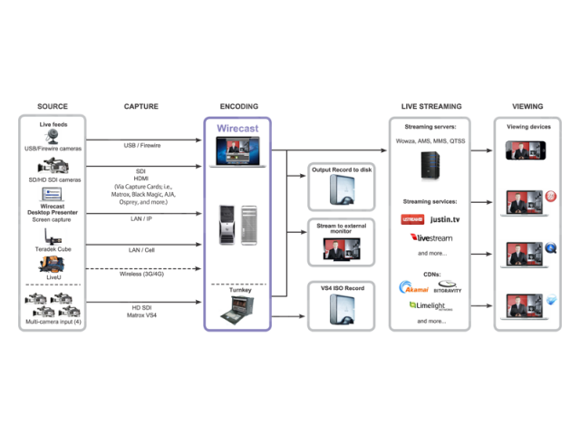 Telestream Wirecast je sveobuhvatni softver za produkciju streaminga uživo koji vam omogućuje da zatražite produkciju uživo i izravno streamate za emitiranje na više poslužitelja i platformi u isto vrijeme. S Wirecastom možete istovremeno usmjeravati više kamera uživo, dinamički miješati druge medije kao što su filmovi, slike, zvuk i dodavati produkcijske značajke kao što su prijelazi, titlovi, ključanje i još mnogo toga. Wirecast je idealan za emitiranje internetskih emisija profesionalnog izgleda uživo, vijesti, sportskih događaja, koncerata, poslovnih sastanaka, predavanja i još mnogo toga.