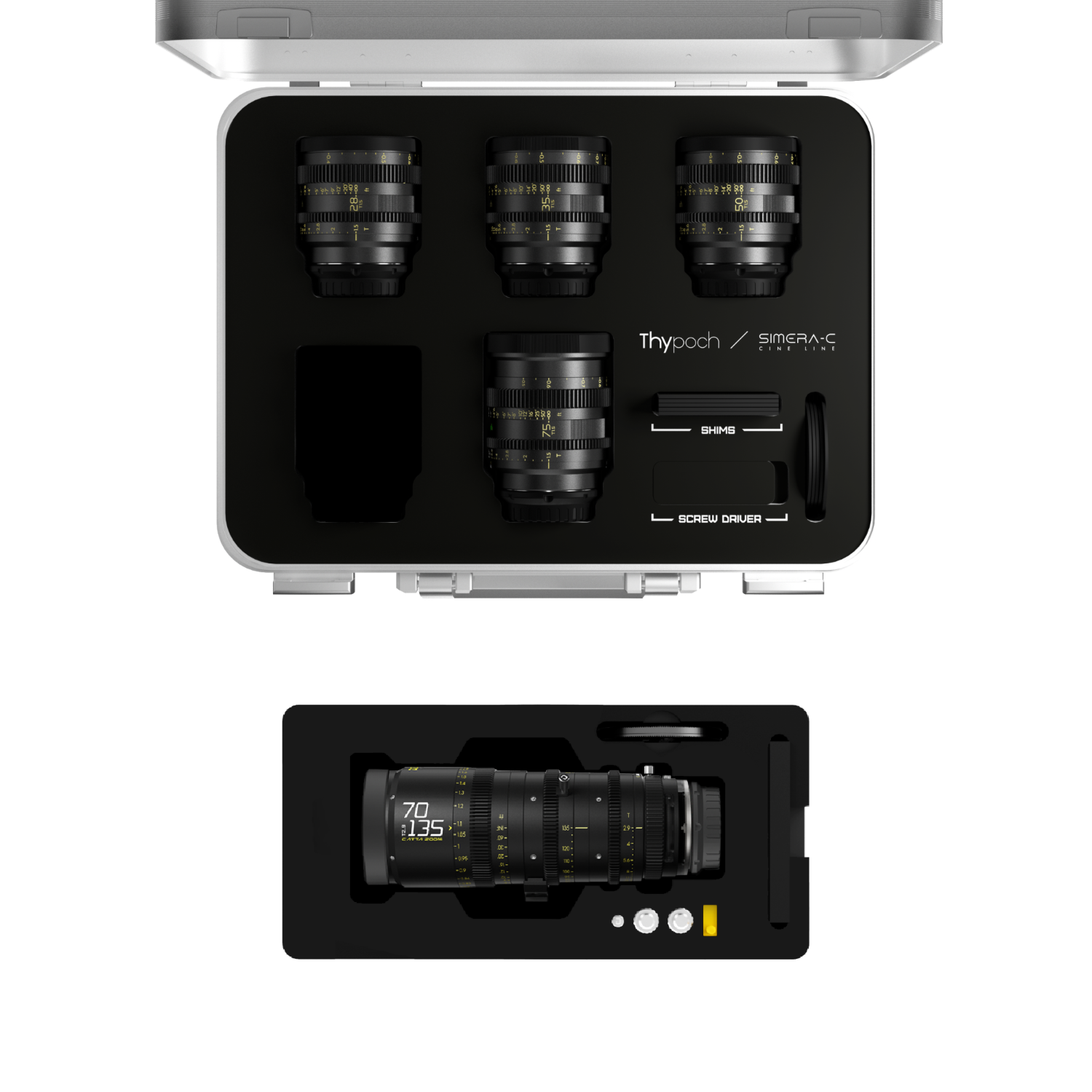 Premium set objektiva Thypoch Simera-C s fiksnom žarišnom duljinom + zum objektiv DZOFILM Catta Zoom 70-135 mm . Ukupni raspon žarišne duljine od 28-135 mm pokriva razne kreativne potrebe.