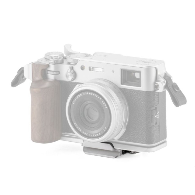 Ova ARCA ploča za brzo otpuštanje pričvršćuje se izravno na dno montažne baze drvenim rukohvatom za Fujifilm X100VI fotoaparat.