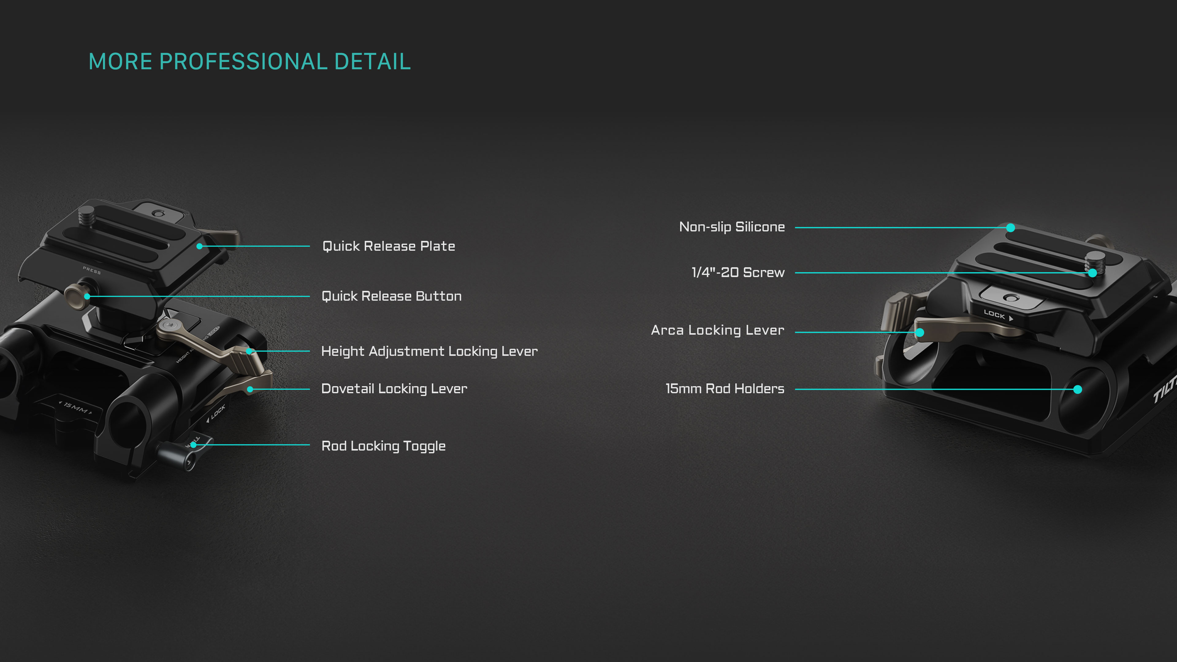 Ova osnovna ploča od 15 mm omogućuje korisnicima korištenje šipki od 15 mm (nisu uključene) za montažu raznih dodataka kao što su mat kutije ili sustavi za fokusiranje.