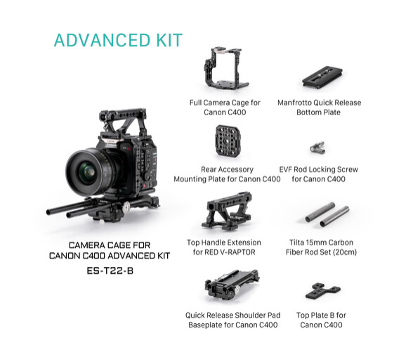 Kavez za kameru Tilta ES-T22-B za Canon C400 (napredni komplet) pruža kompletan modularni ekosustav dizajniran za poboljšanje stabilnosti, proširenje mogućnosti montaže i pojednostavljenje prijelaza između snimanja s stativa, ramena i snimanja iz ruke. Kavez uključuje gornju, lijevu i desnu bočnu ploču, donju ploču za brzo otpuštanje tipa Manfrotto, gornju ručku, šipke od 7,8" i 15 mm, višenamjensku stražnju ploču i dodatnu gornju ploču B za veću kompatibilnost s priborom. Priloženi vijak za zaključavanje šipke EVF-a osigurava potpunu kompatibilnost s elektroničkim tražilom Canon C400.