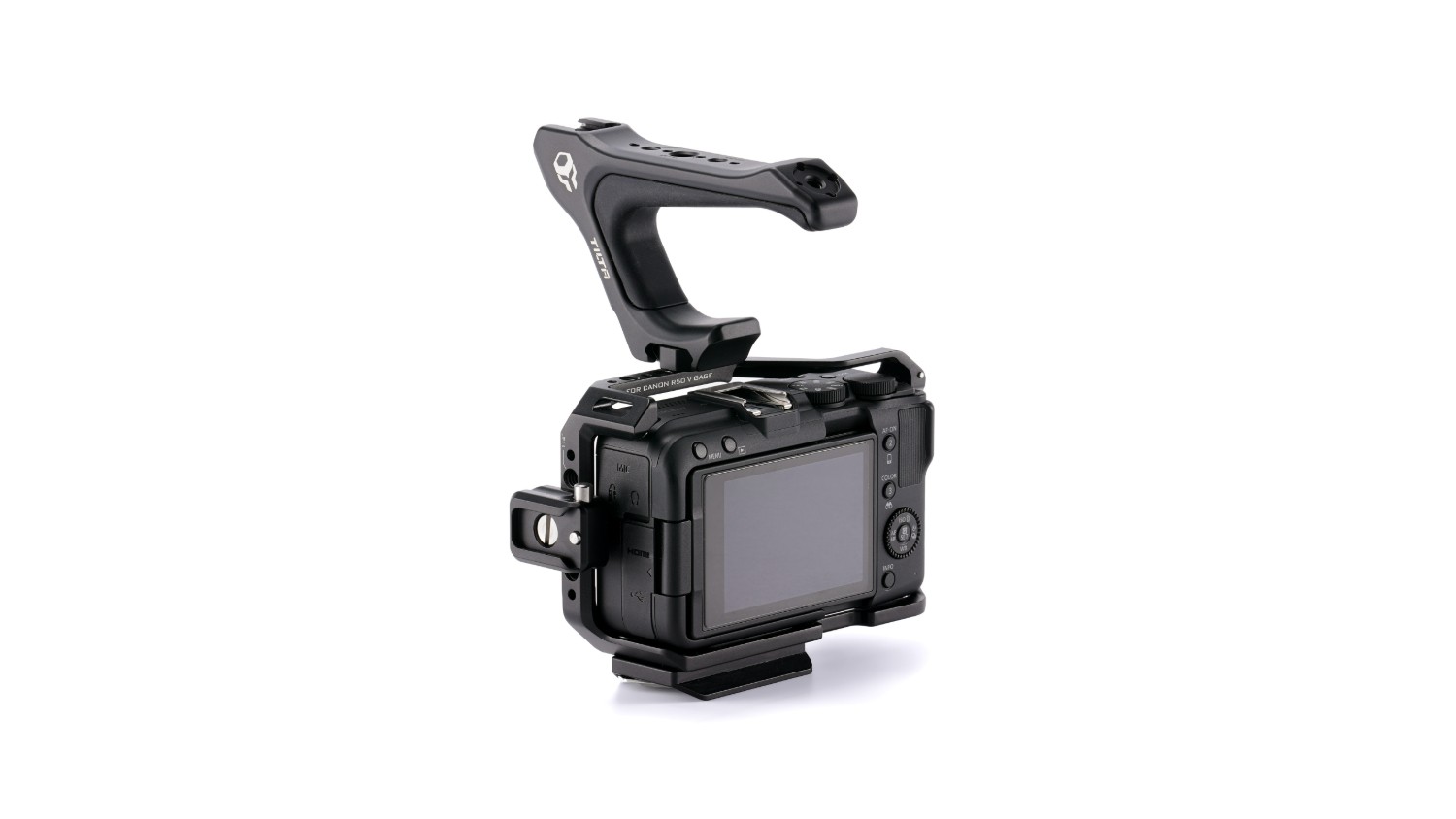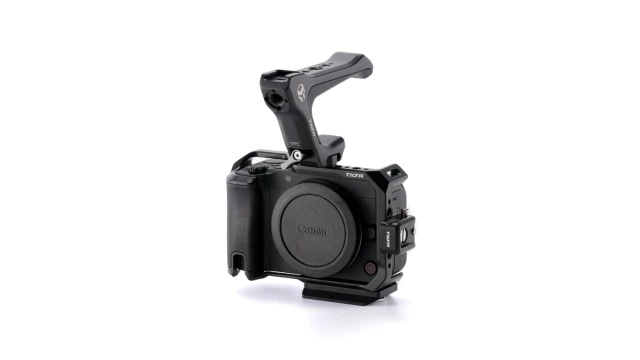 Osnovni komplet kaveza za Canon R50 V. Ovaj kavez služi kao zaštita za tijelo vašeg fotoaparata, a istovremeno vam omogućuje pričvršćivanje širokog raspona vanjske opreme pomoću nekoliko opcija montaže, uključujući priključak za blic , NATO šinu i navoje od 1/4"-20 s točkama za lociranje .