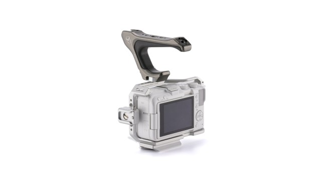 Dizajn uključuje integrirani rukohvat s gumenim rukohvatom koji se prilagođava obliku dlana, što držanje fotoaparata čini udobnijim nego s tradicionalnim držačem.