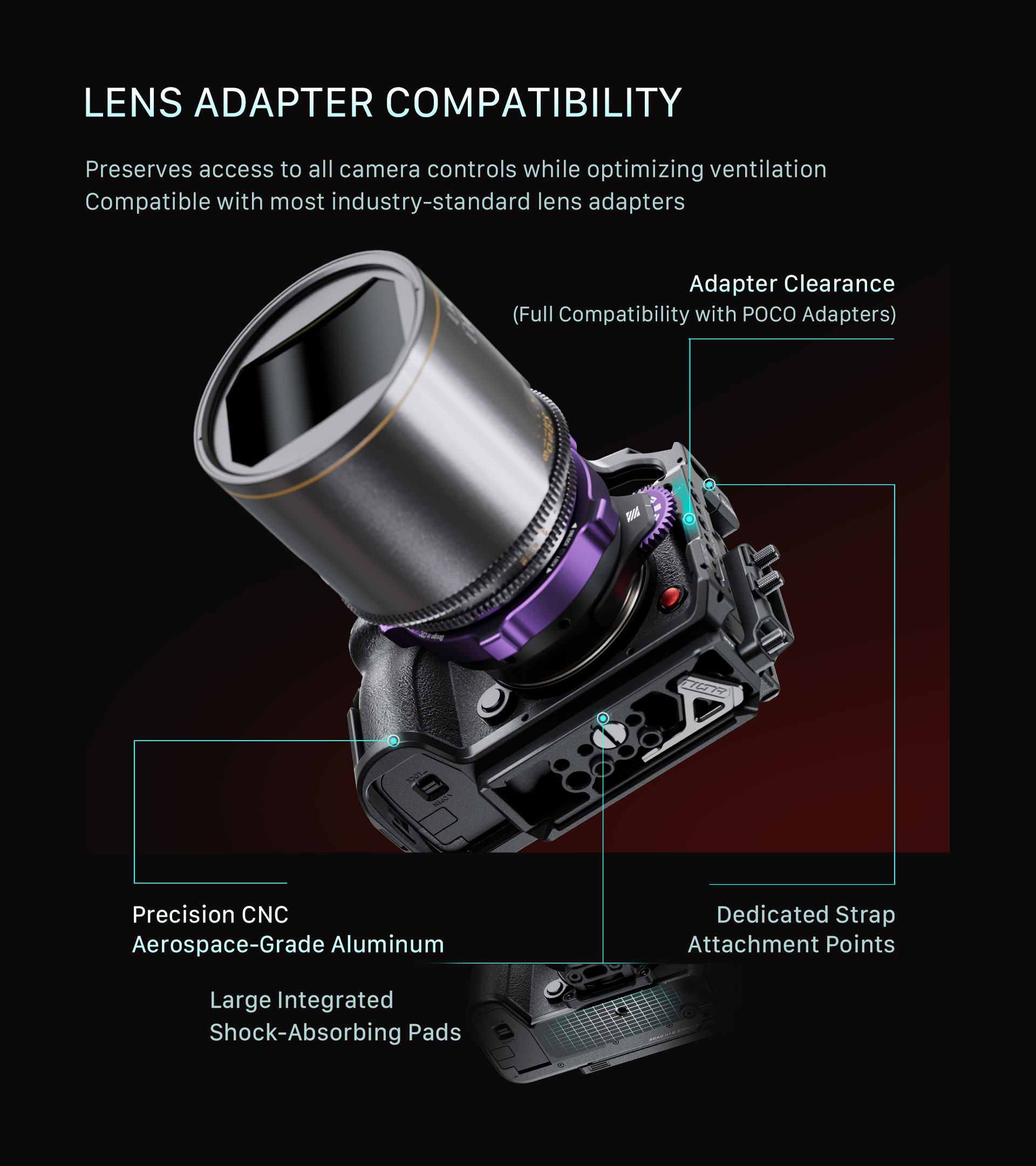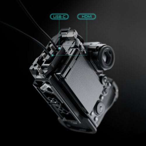 Priložena stezaljka za HDMI i USB-C kabel osigurava da će oba kabela ostati sigurna kada su spojena na tijelo kamere. Tri kontaktne točke između kamere i okvira osiguravaju čvrstu vezu s tijelom kamere i snažan temelj za montažu dodatne opreme.