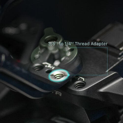 Ovaj kavez za kameru ima nosače za remen za zglob, navoje od 1/4″-20 s točkama za lociranje i adapter s navoja od 3/8″-16 na 1/4″-20.