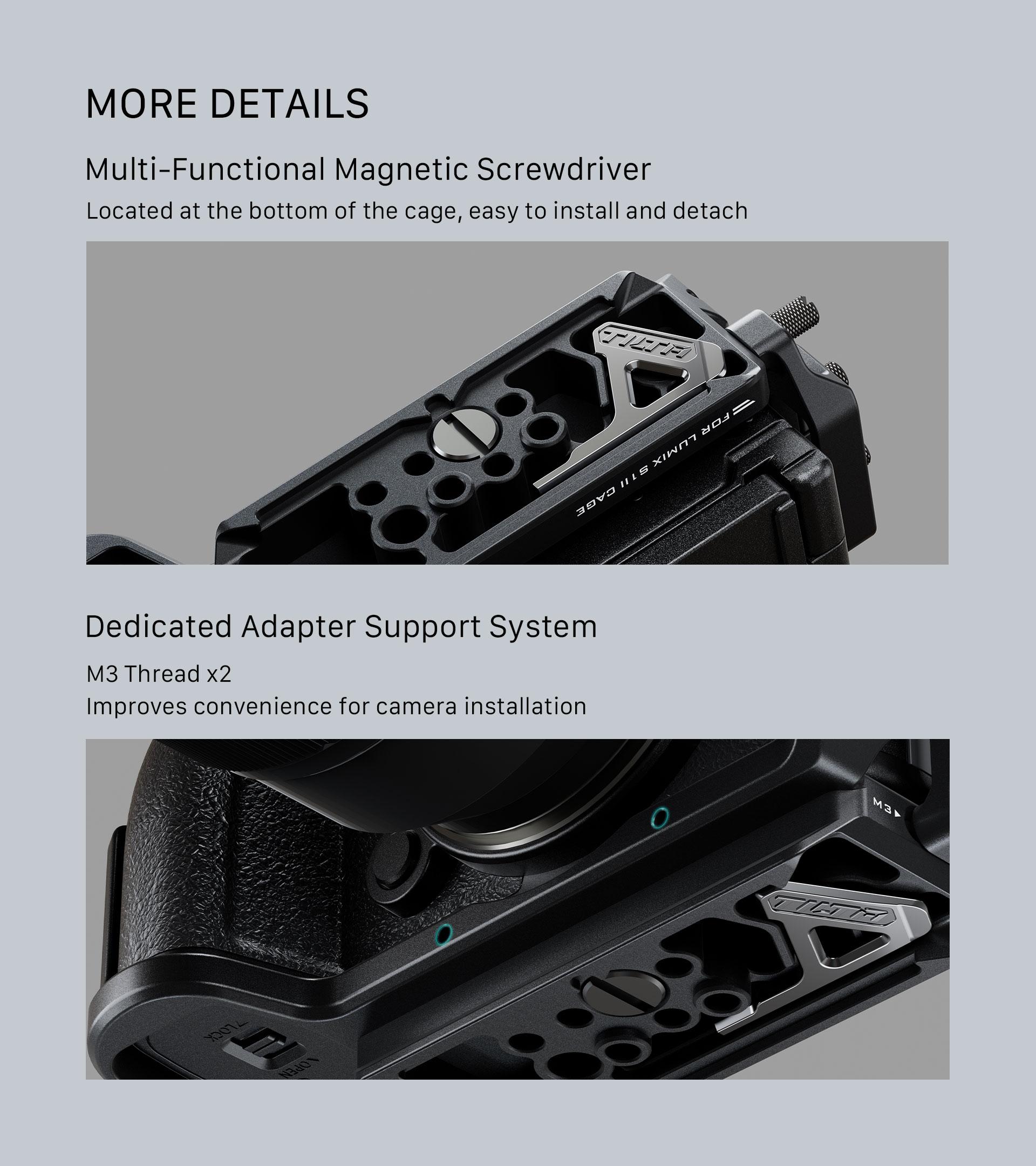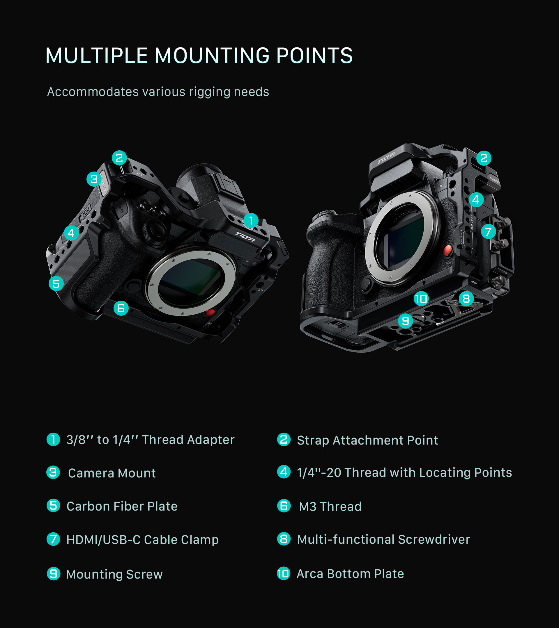 Temelj ovog kompleta je Full Camera Cage, koji pruža zaštitu i proširuje mogućnosti montaže za S1R II, Lumix S5 II, S5 IIX i G9 II.