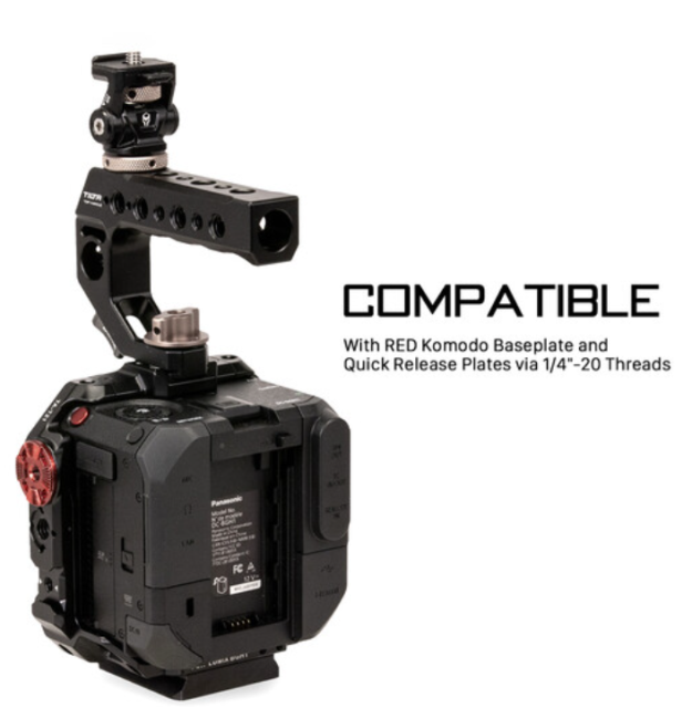 Tilta TA-T21-BB Kit B je ultimativni profesionalni paket dodatne opreme za Panasonic Lumix BGH1 (i BS1H). Aluminijski kavez koji prianja i potpuno se omotava prvenstveno oko prednje strane fotoaparata za elegantan, niskoprofilni izgled, a istovremeno pruža široke mogućnosti montaže: tri hladna papučice, dvije NATO šine, dvije ARRI M6 rozete, više navoja 1/4"-20 i 3/8"-16 te sedam donjih navoja za stativ za savršeno balansiranje gimbala. Priložena lagana gornja ručka za brzo otpuštanje nudi dodatnu hladnu papučicu i priključak za šipku od 15 mm, dok nosač monitora s podesivom napetosti omogućuje brzo i sigurno pozicioniranje monitora. Dvostruke ploče za brzo otpuštanje pričvršćuju se izravno na dno kaveza za trenutnu zamjenu stativa ili glave, a namjenski nosač adaptera za EF-mount s utorima za podešavanje osigurava izuzetno čvrstu stabilnost adaptera objektiva.