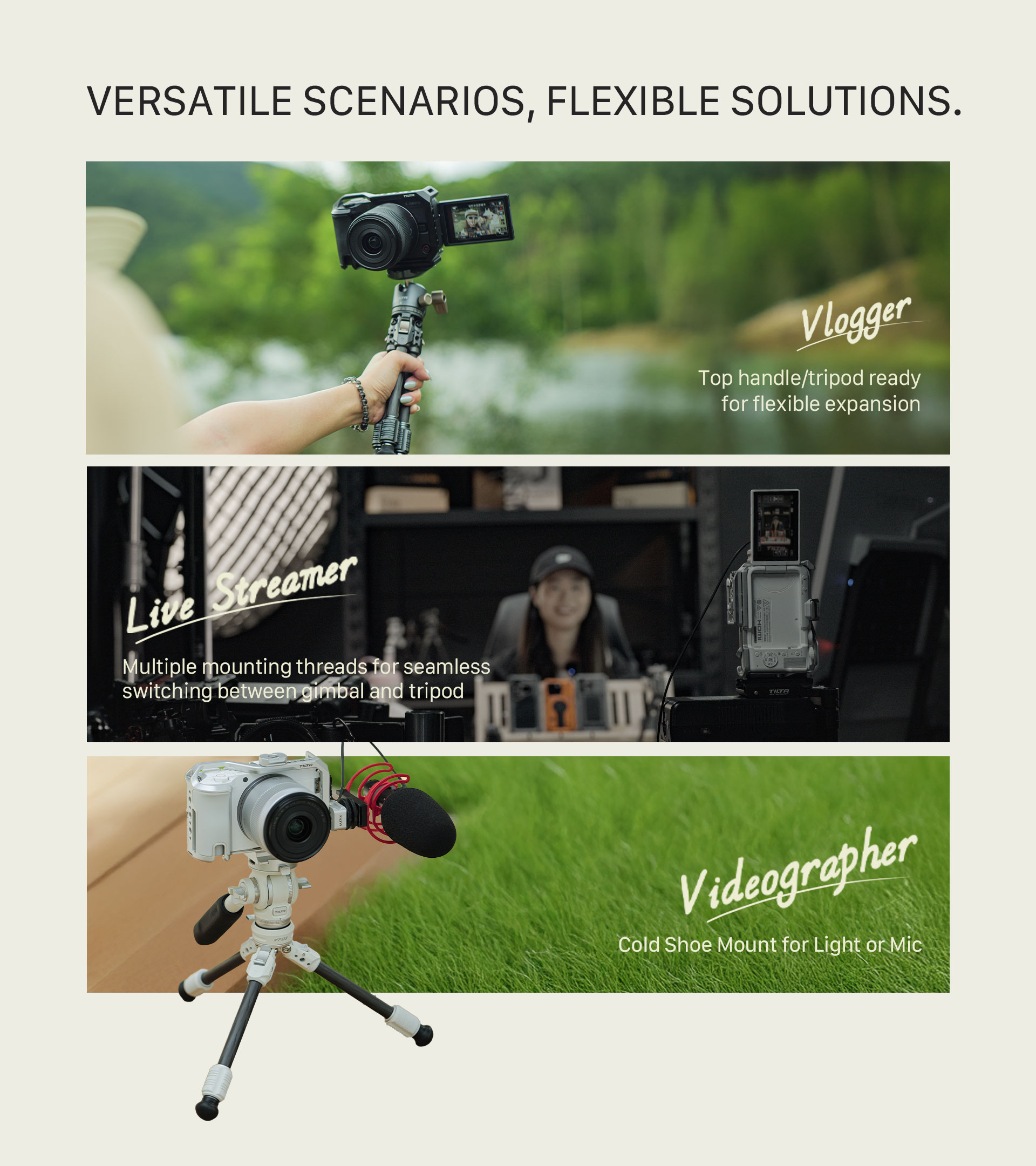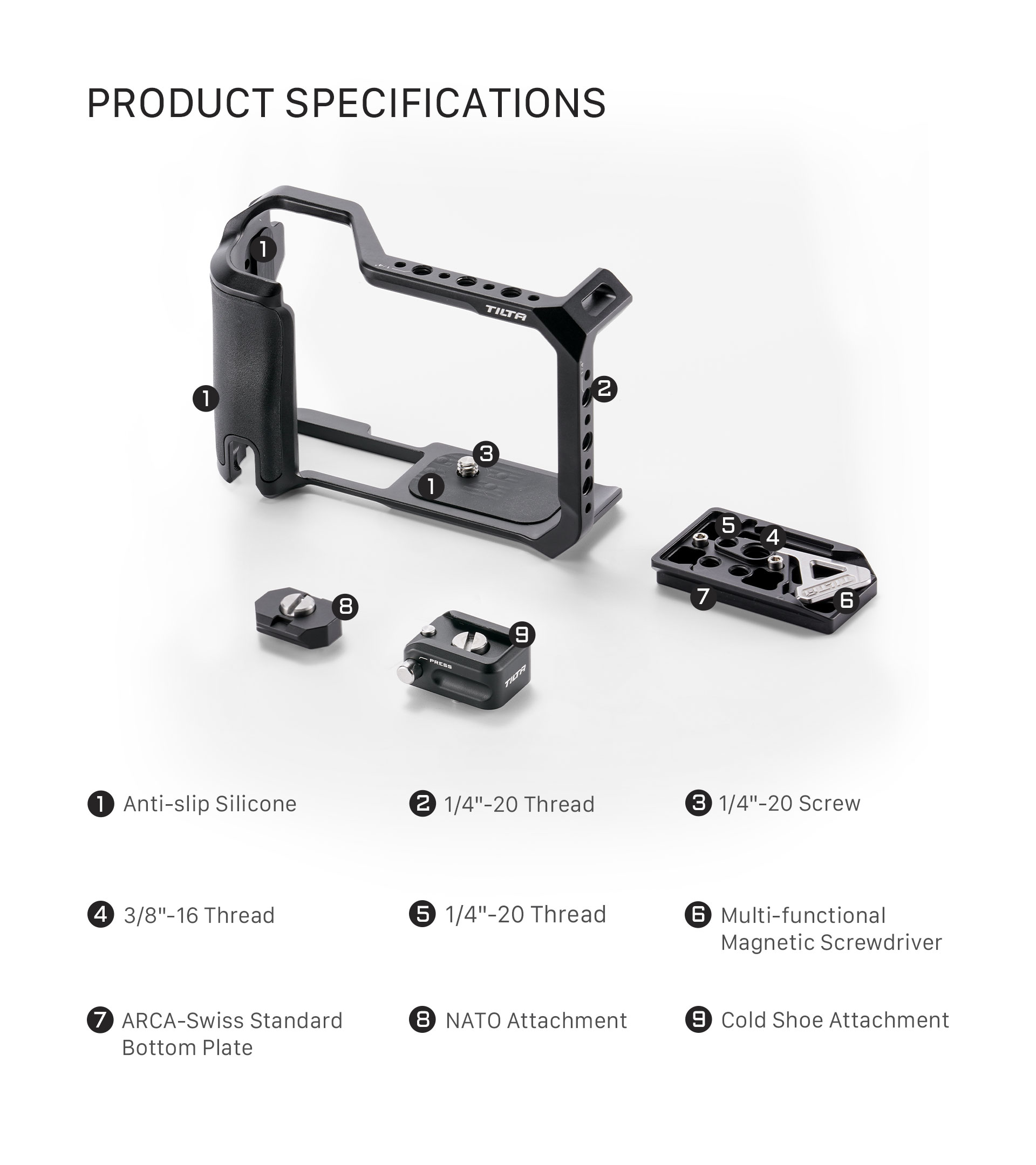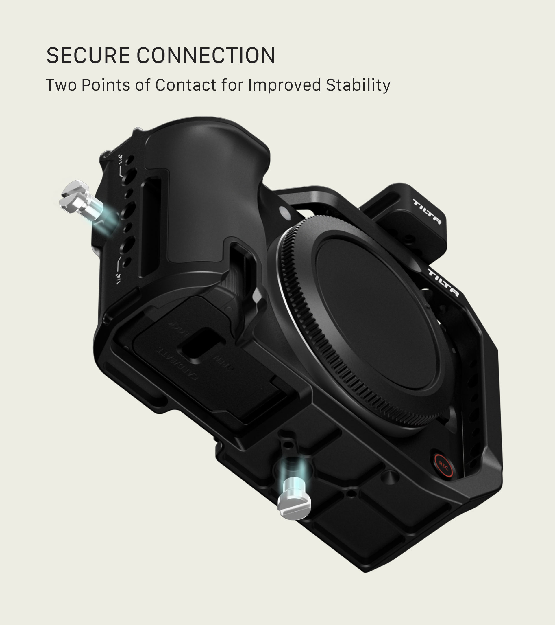 Ovaj kavez ima novi dizajn koji omogućuje uklanjanje tri glavne točke montaže kada nisu potrebne jer su montažne ploče , NATO, Cold Shoe i ARCA odvojive.