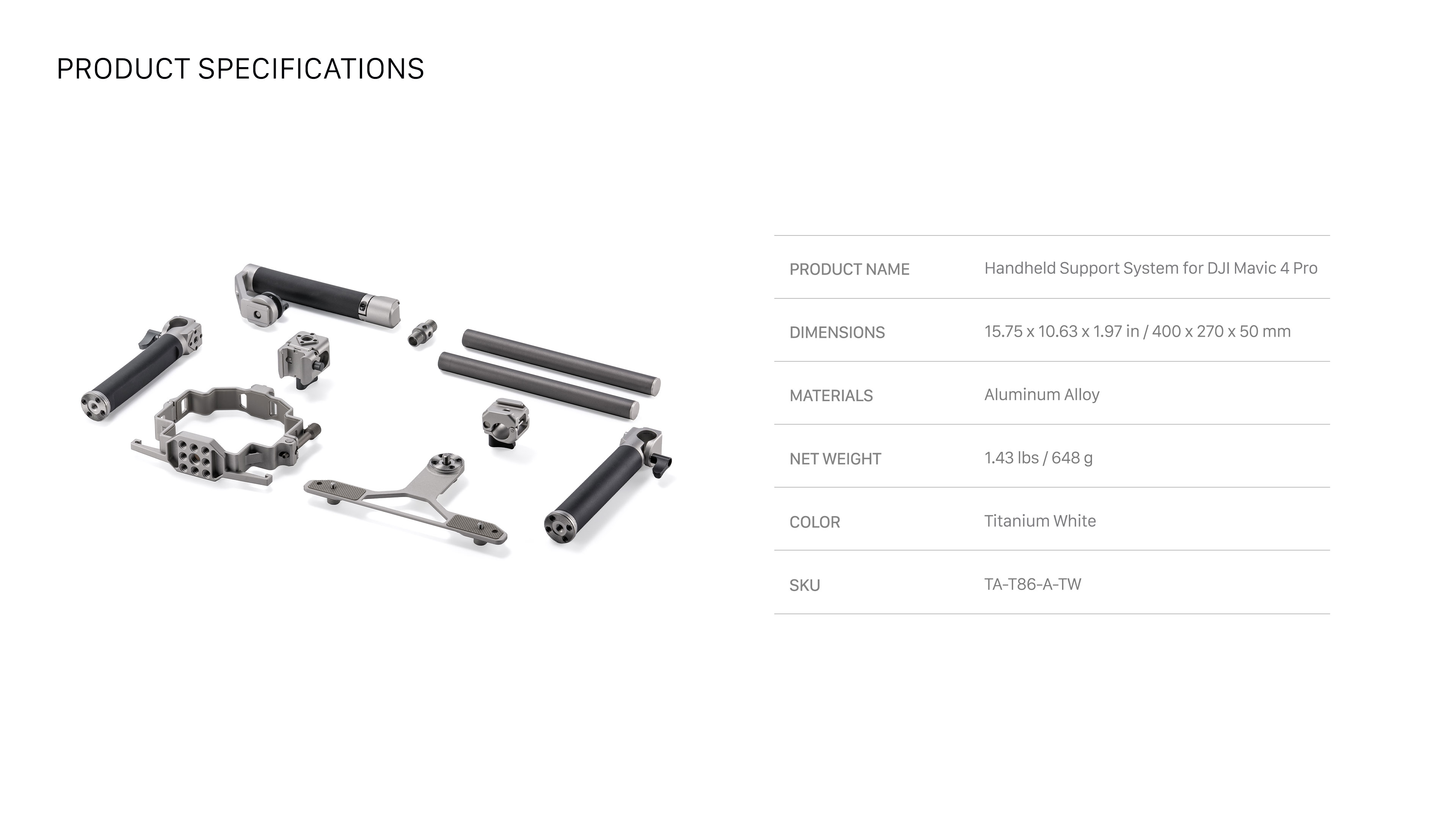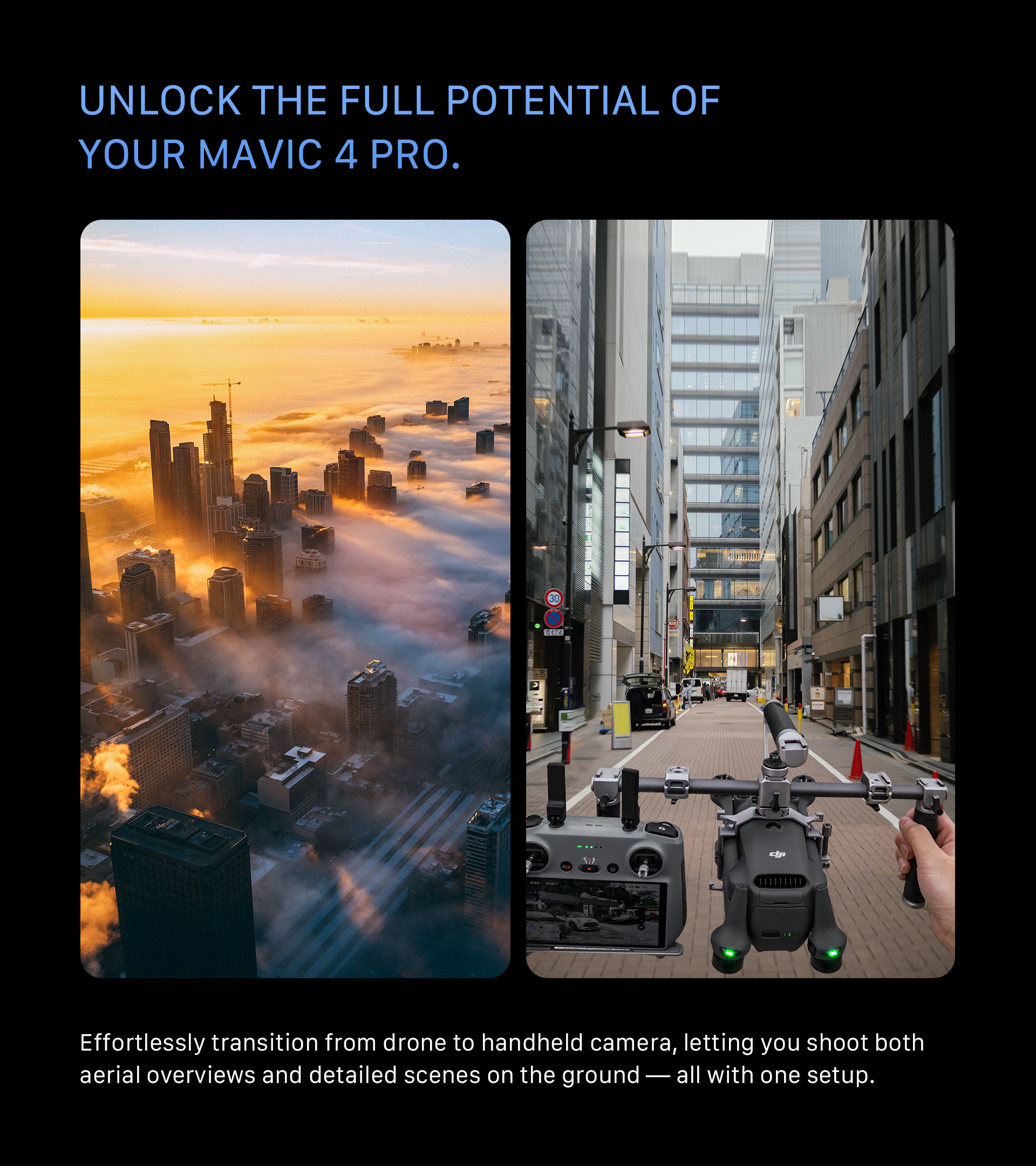 Ovaj ručni sustav podrške otključava nove kreativne mogućnosti pretvarajući vaš dron u potpuno funkcionalnu ručnu opremu za kameru. Savršen za filmaše, kreatore sadržaja i produkcijske timove u pokretu, ovaj posebno dizajnirani kavez za kameru nudi stabilno, ergonomsko rješenje za snimanje sa zemlje s Mavic 4 Pro.