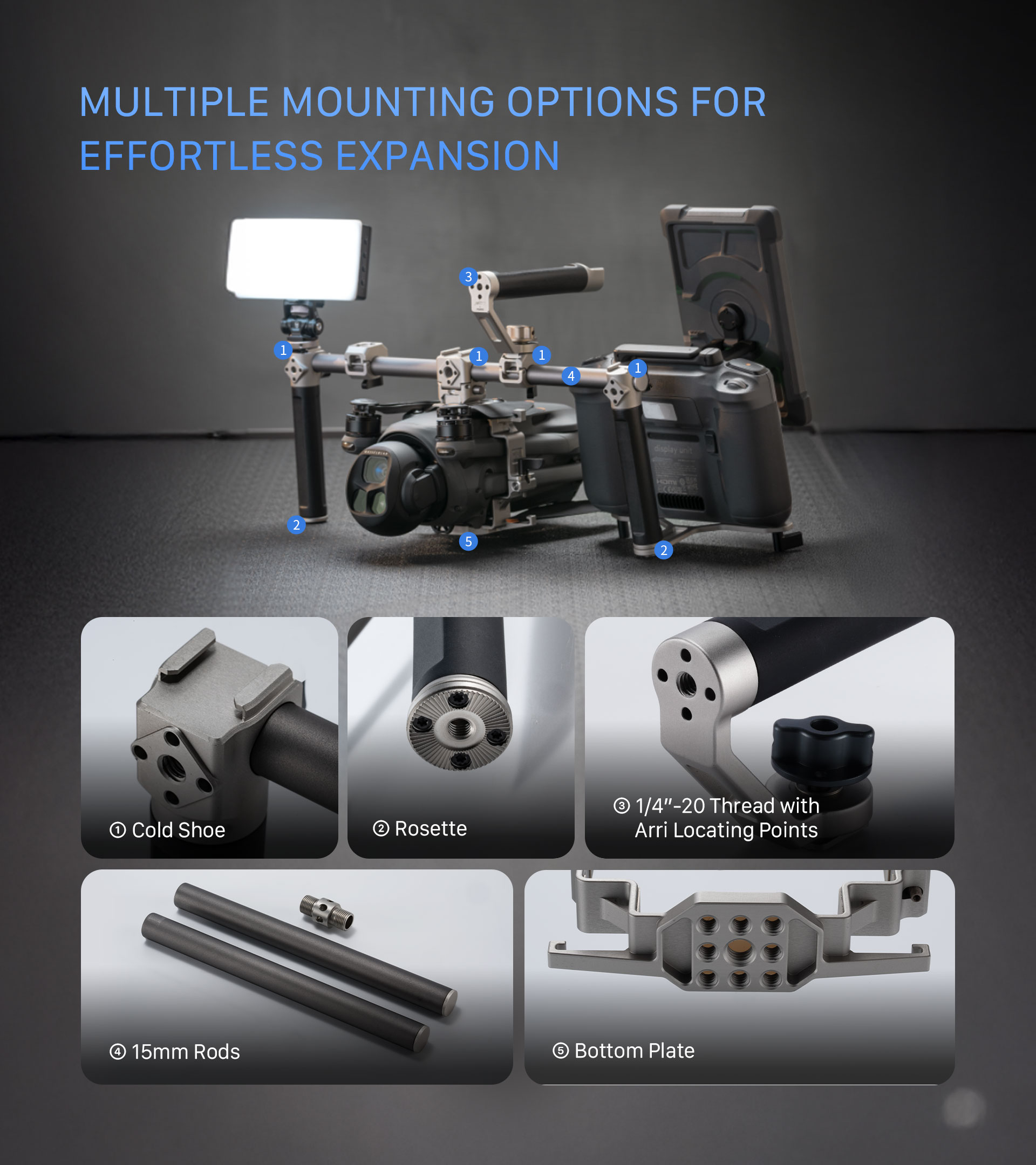 Savršen za filmaše, kreatore sadržaja i produkcijske timove u pokretu, ovaj posebno dizajnirani kavez za kameru nudi stabilno, ergonomsko rješenje za snimanje sa zemlje s Mavic 4 Pro.