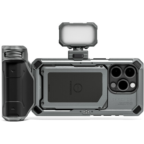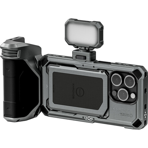 Osnovni komplet Tilta Khronos iPhone 15 Pro u svemirsko sivoj boji s baterijom izrađen je posebno za entuzijaste snimanja mobilnih filmova. Sadrži Khronos iPhone 15 Pro Case, koji osigurava sigurno pristajanje i kompatibilnost s Khronos Accessory Ecosystem. Komplet uključuje Khronos Focus PD ručku za poboljšanu stabilnost i kontrolu, zajedno s Khronos Mini Daylight LED svjetlom, koje nudi tri razine svjetline i visoki CRI od 95 za preciznu reprodukciju boja. S podesivim nagibom i horizontalnom rotacijom, filmaši dobivaju preciznu kontrolu nad kadriranjem i kompozicijom. Integrirana baterija podržava USB-C punjenje, osiguravajući produljenu upotrebljivost bez prekida.