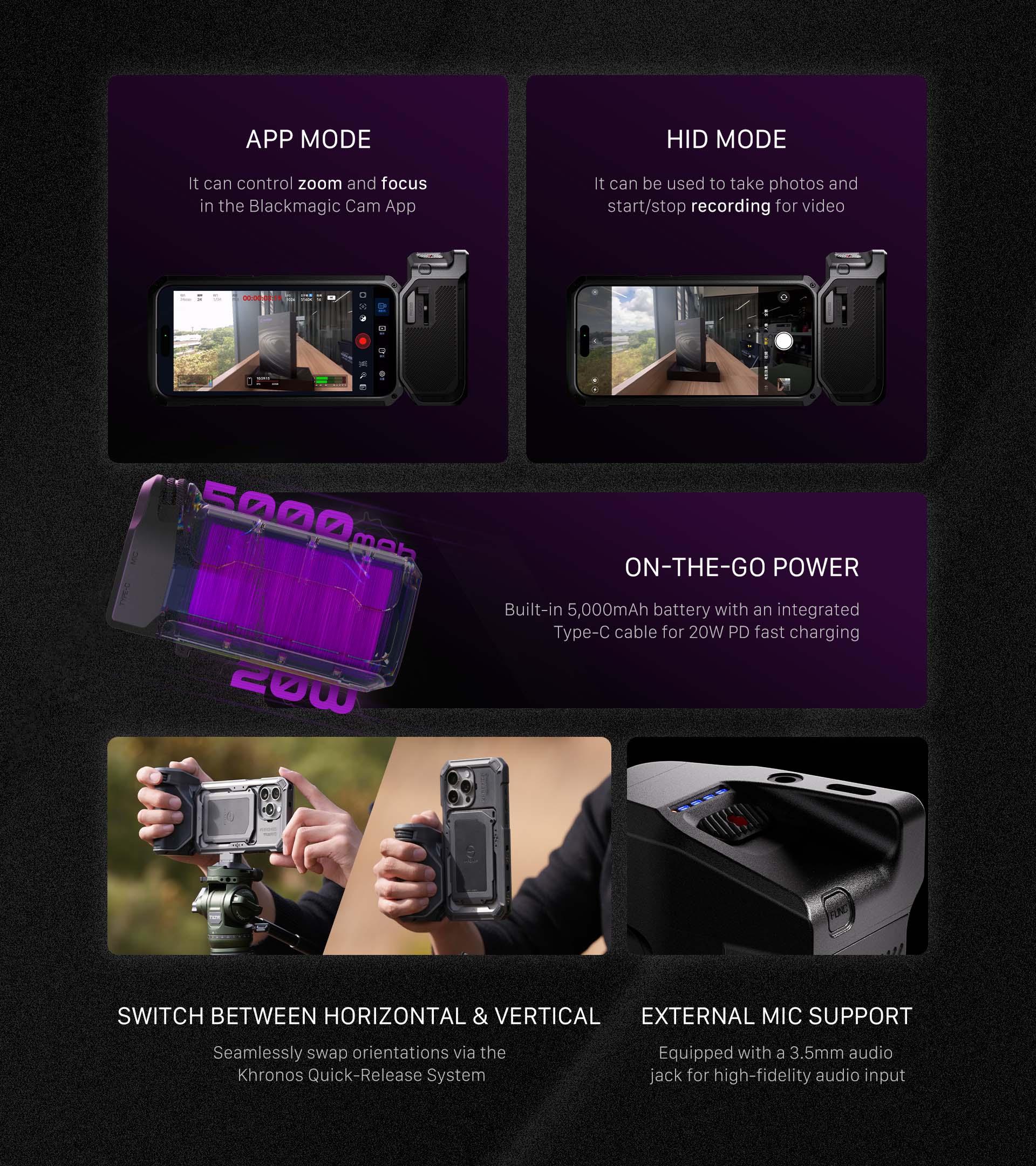 Ručka se spaja s iPhoneom 16 putem integriranog USB-C kabela i koristi Bluetooth za upravljanje fokusom ili zumiranjem putem kotačića na prednjoj strani ručke. To također pruža veću stabilnost pri radu sustava, a gumb za snimanje osigurava da korisnici ne moraju pustiti ručku za početak snimanja.