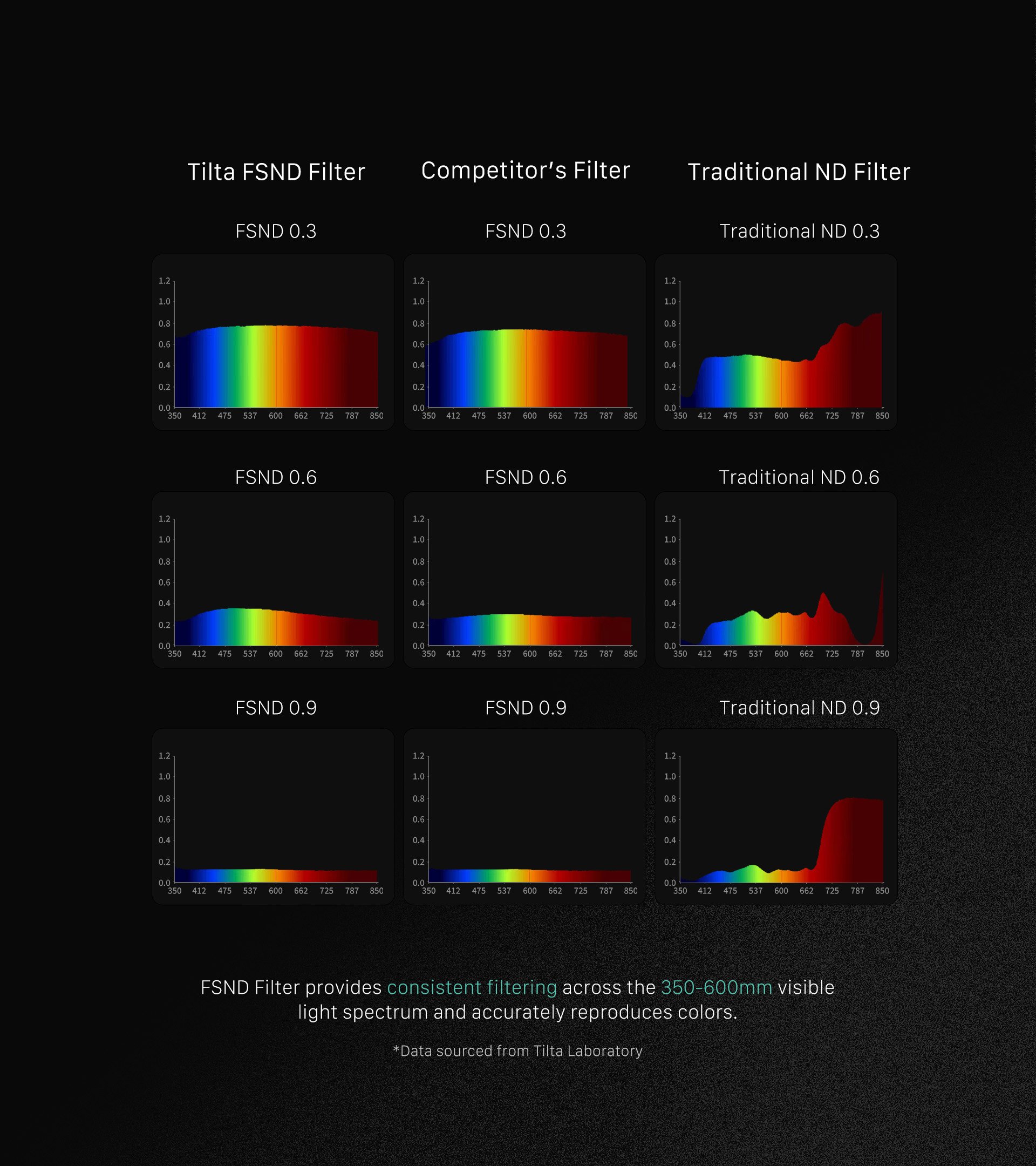 Uključeni ND filteri pružaju veću kontrolu nad ekspozicijom omogućujući korisnicima smanjenje svjetla vidljivog senzoru, što također pomaže u održavanju konzistentne brzine zatvarača pri snimanju u okruženjima s jačim osvjetljenjem poput dnevnog svjetla.