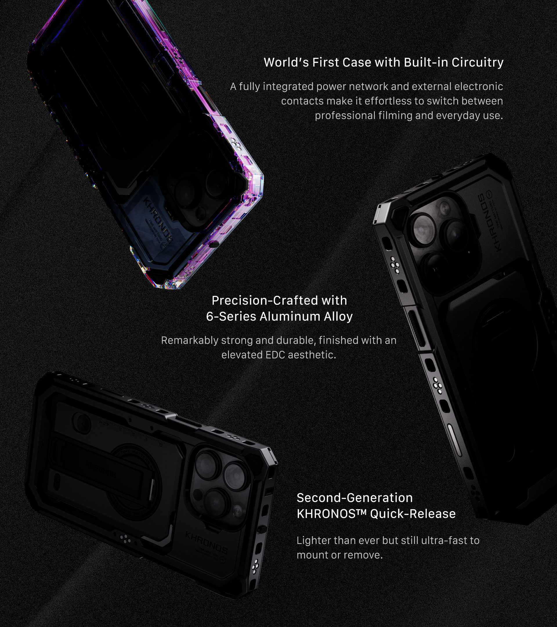 Khronos kućište ima integrirane elektroničke kontaktne točke, što vam omogućuje propuštanje napajanja kroz kućište za napajanje pribora kada koristite opcionalnu Power Handle ručku. Novost kod modela 16 je dodirna traka za upravljanje kamerom koja korisnicima omogućuje potpuni pristup funkcionalnosti dodirne trake na iPhoneu 16.