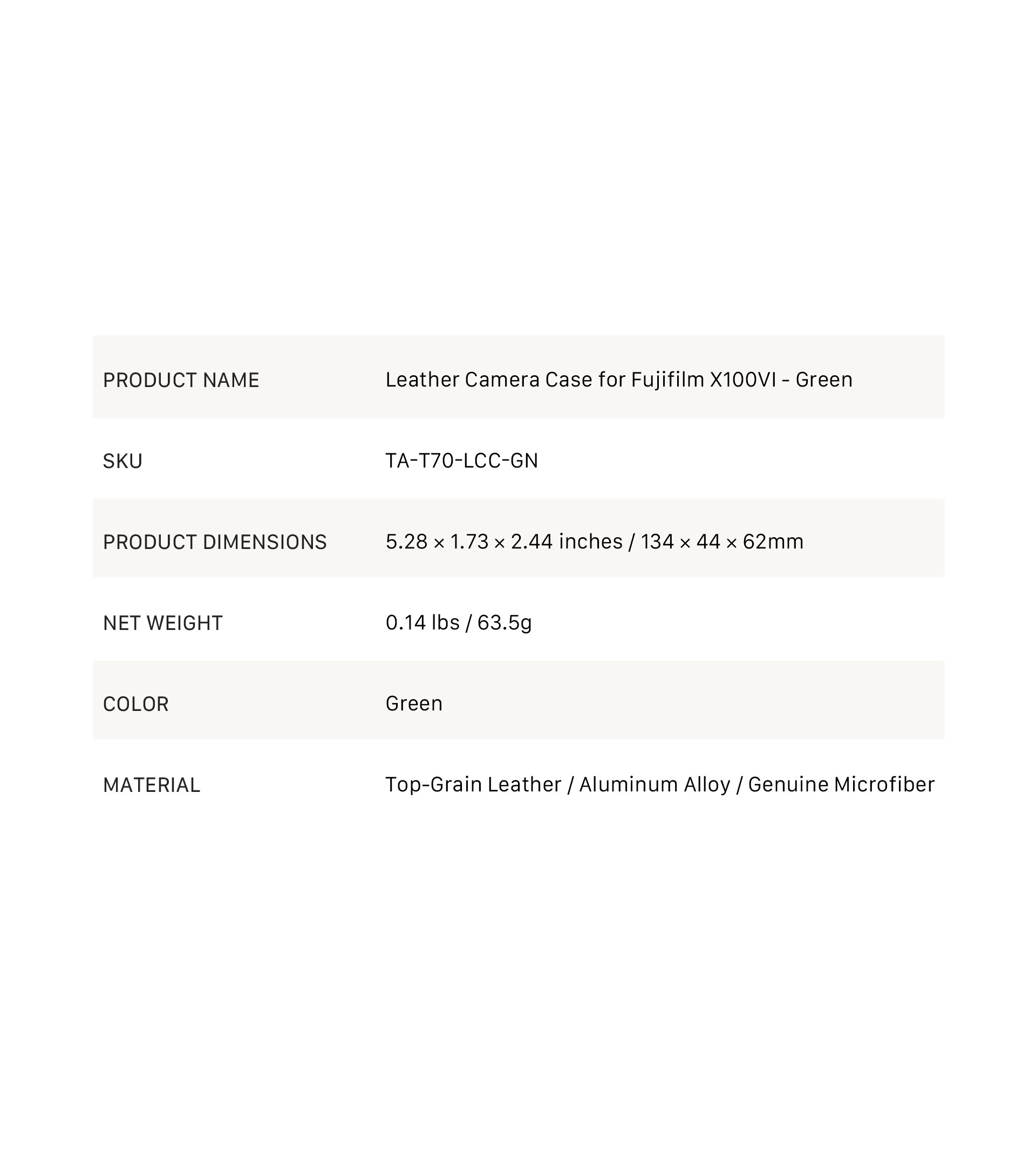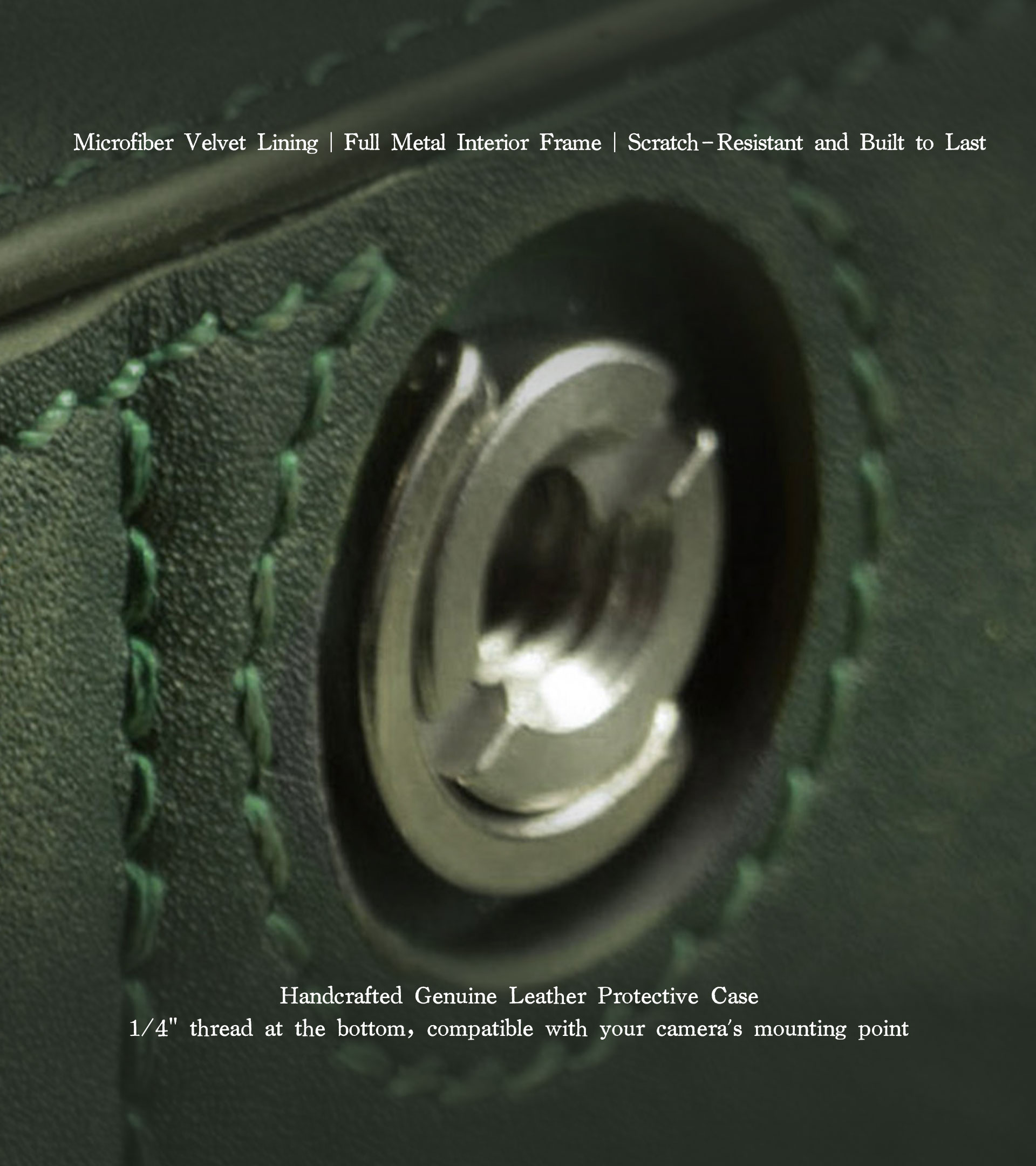 Predstavljamo kožnu torbicu za fotoaparat Fujifilm X100VI. Ova se torbica montira pomoću vijka 1/4″-20 i pruža korisnicima ugodniji način rukovanja tijelom fotoaparata putem integrirane ručke. Dizajn također pruža dodatnu zaštitu za donji dio tijela fotoaparata, što je posebno korisno prilikom spuštanja fotoaparata.
