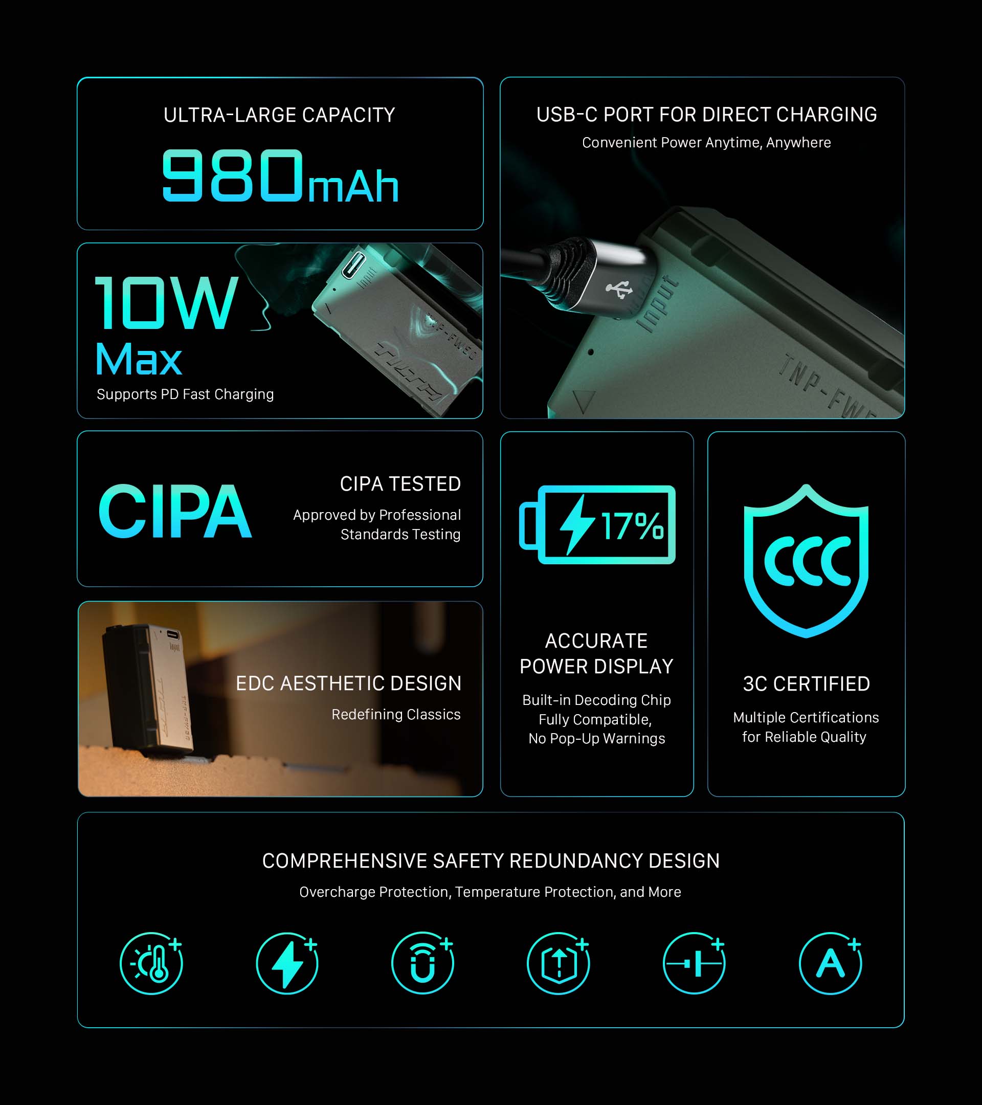 S dimenzijama koje odgovaraju originalu, besprijekorno se uklapa u vaš fotoaparat, osiguravajući savršenu kompatibilnost. Također je opremljen višestrukim međunarodnim sigurnosnim certifikatima (CCC, FCC, CE, PSE, KC, UL, BSMI), nudeći bezbrižnost i pouzdanu zaštitu.