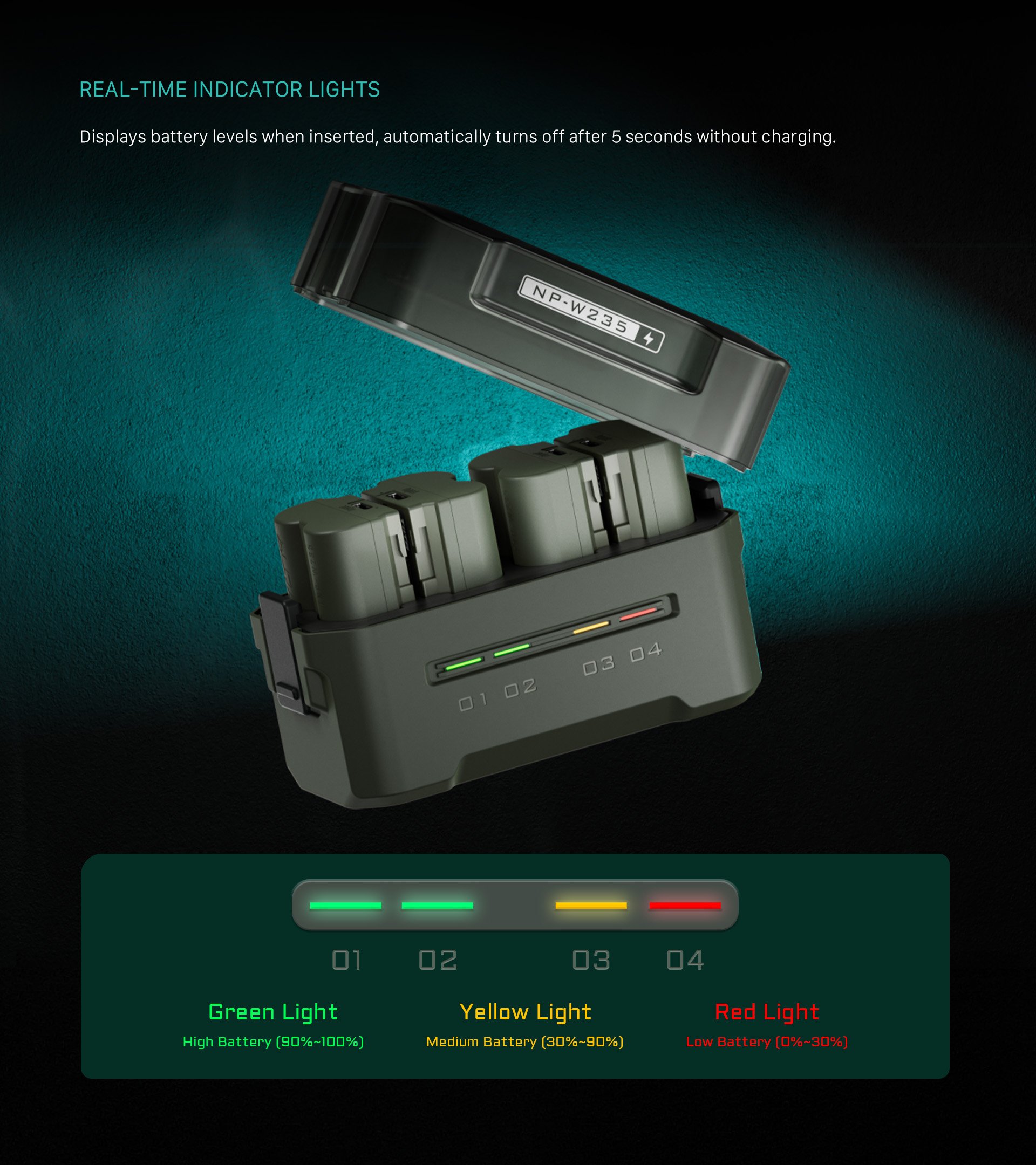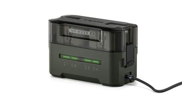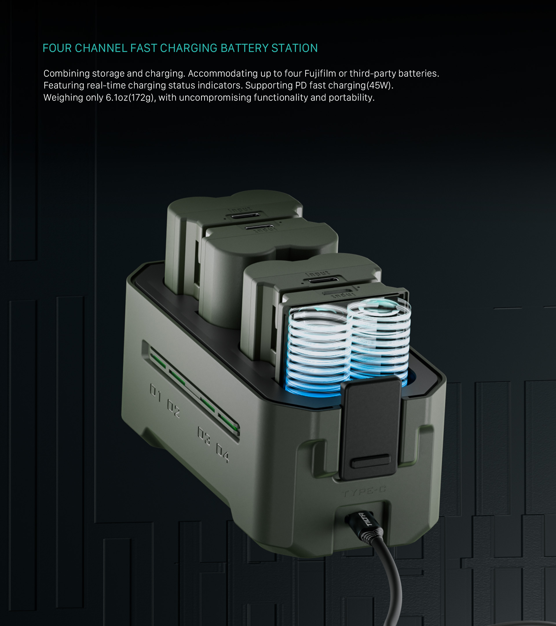Ova kompaktna stanica za punjenje dizajnirana je za podršku Fujifilm i NP-W235 baterijama trećih strana, nudeći četiri utora za jednostavno punjenje i praktično skladištenje.