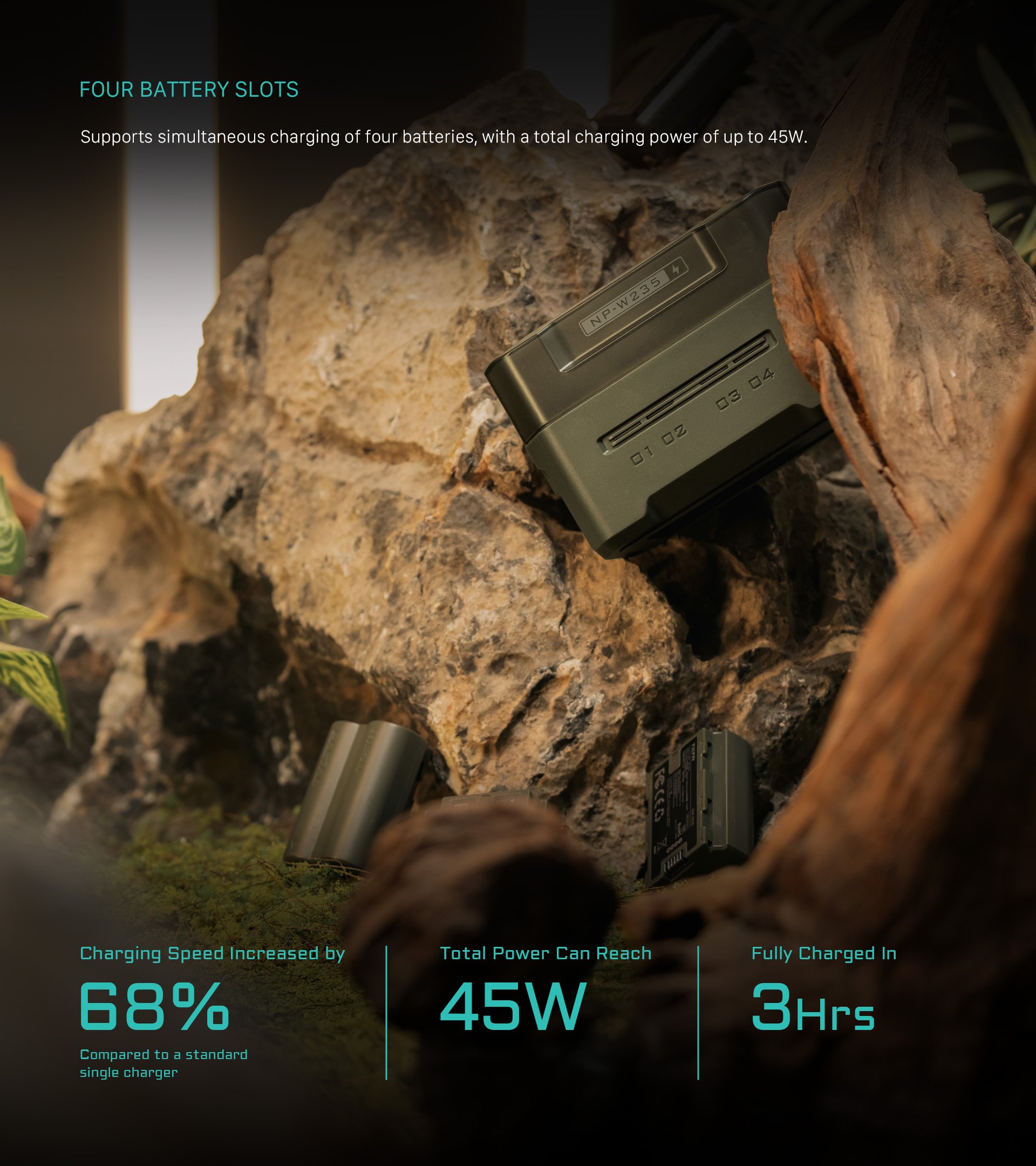 Ovaj kompaktni komplet baterija za punjenje (4 baterije) dizajniran je za podršku Fujifilm i baterijama trećih strana NP-W235, nudeći četiri utora za jednostavno punjenje i praktično skladištenje. Opremljen brzim punjenjem od 45 W PD, pruža impresivnih 68% brže punjenje od standardnog jednog punjača, osiguravajući da su vaše baterije spremne za djelovanje za samo 3 sata.