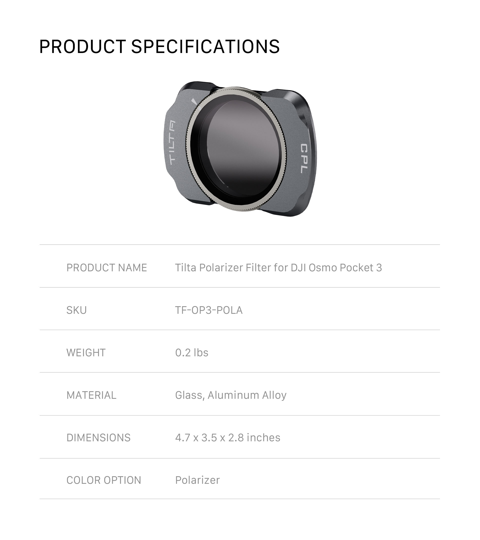 Ovaj filter je posebno dizajniran za Pocket 3 i ima magnetski priključak za jednostavno spajanje, dok dizajn s utorima za brzo otpuštanje omogućuje brzo uklanjanje jednim dodirom. Može proizvesti precizne i žive boje ograničavanjem reflektirane svjetlosti i sprječavanjem neželjenog odsjaja uzrokovanog reflektirajućim površinama poput vode ili stakla.