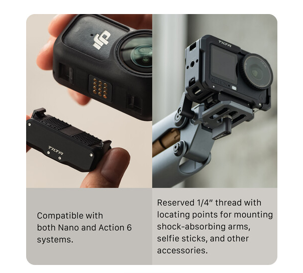 Tilta TA-T95-QRMB-TG brzootpuštajuća baza za montažu je magnetsko, dvosmjerno rješenje za montažu, posebno dizajnirano za DJI Osmo Action 6 i Nano, nudeći brzo pričvršćivanje, fleksibilnu orijentaciju i ugrađeni navoj od 1/4″-20 za proširenu montažu dodatne opreme.