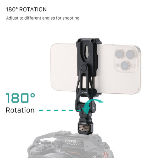 Tilta TA-PMB5-1420K-B je potpuna verzija rotirajućeg nosača za montažu telefona V2 spremna za montažu, koja uključuje stezaljku za telefon od 360° (odgovara uređajima širine 3–3,8″) s namjenskim adapterom protiv uvrtanja od 1/4"-20, tako da možete trenutno pričvrstiti svoj pametni telefon na bilo koji kavez, ručku, magičnu ruku ili navoj za korištenje kao redateljski monitor, zaslon za prijenos uživo, alat za kadriranje ili bežični zaslon za praćenje fokusa.