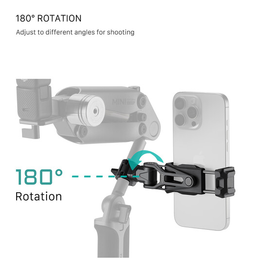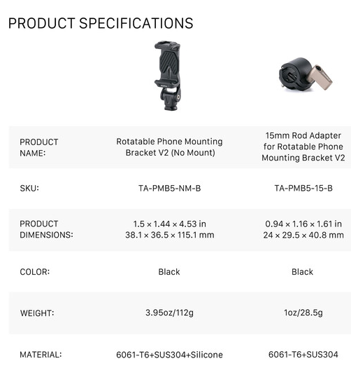 Tilta TA-PMB5-15K-B rotirajući nosač za montažu telefona V2 s 15 mm nosačem za šipku je profesionalna stezaljka za pametne telefone (odgovara telefonima širine 3–3,8″) s potpunom rotacijom od 360° i čeljustima obloženim silikonom, uparena s jednim 15 mm adapterom za šipku s locirajućim klinovima protiv uvrtanja – idealno za montažu telefona kao redateljskog monitora, bežičnog prijemnika ili protutežu gimbala izravno na bilo koji 15 mm LWS nosač za šipku ili središnju ruku Hydra Alien Mini.