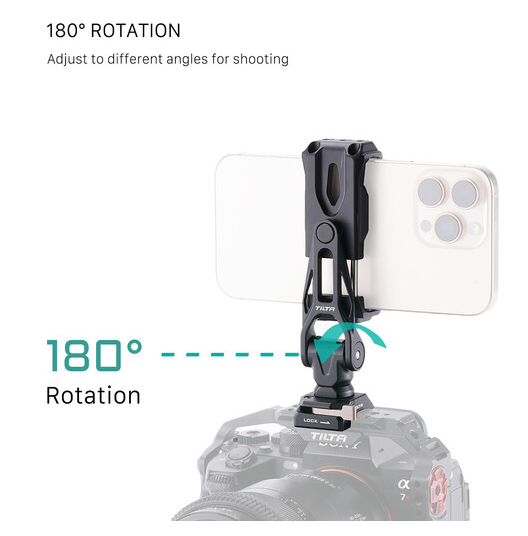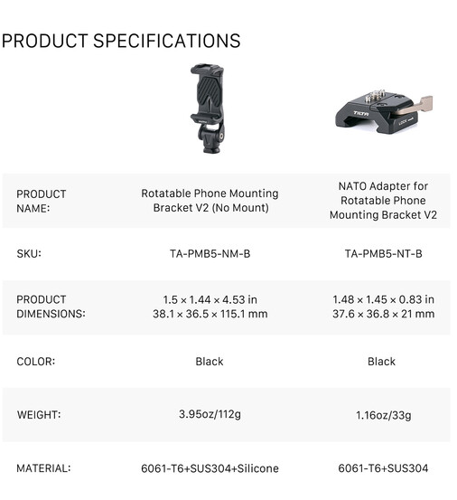 Tilta TA-PMB5-NTK-B rotirajući nosač za telefon V2 s NATO montažom je izuzetno čvrsta, rotirajuća stezaljka za pametne telefone od 360° (odgovara telefonima širine 3–3,8″) koja se izravno pričvršćuje na bilo koju standardnu NATO šinu putem sigurne NATO stezaljke za brzo otpuštanje s klinovima za lociranje protiv uvrtanja – savršeno za pretvaranje vašeg telefona u redateljski monitor, protutežu gimbala ili bežični video prijemnik u sekundama.