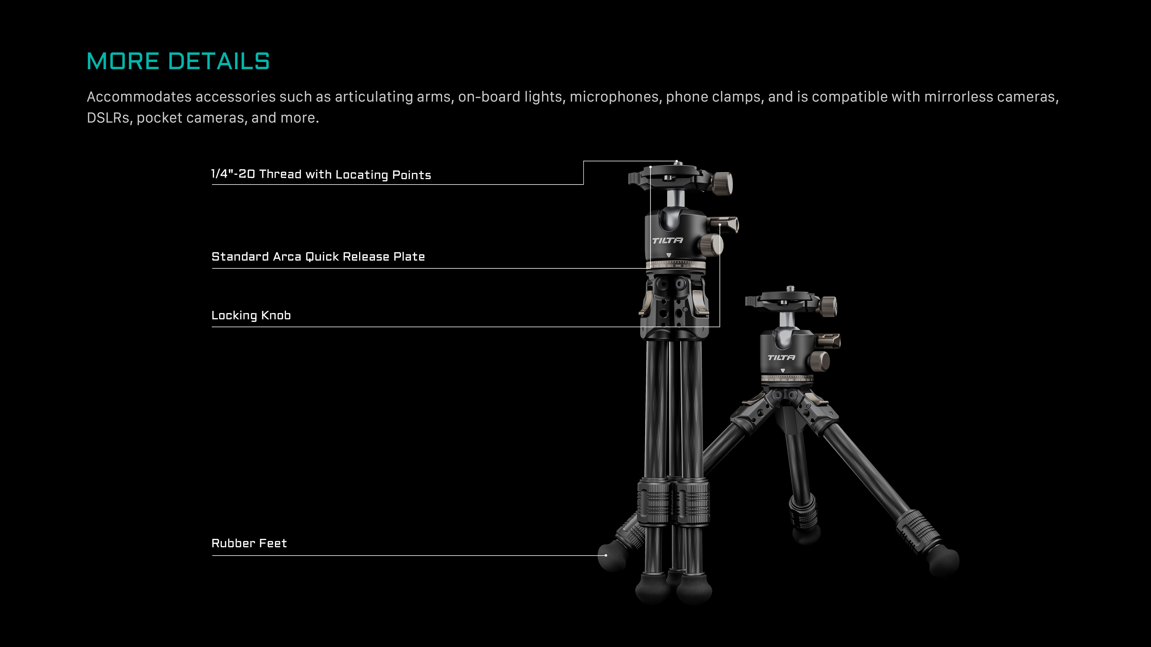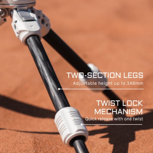 Osim toga, ručka se teleskopski podešava na različite duljine za dodatnu udobnost, dok noge imaju montažne točke od 1/4″-20 s locirajućim klinovima, što korisnicima omogućuje montažu raznih dodataka.