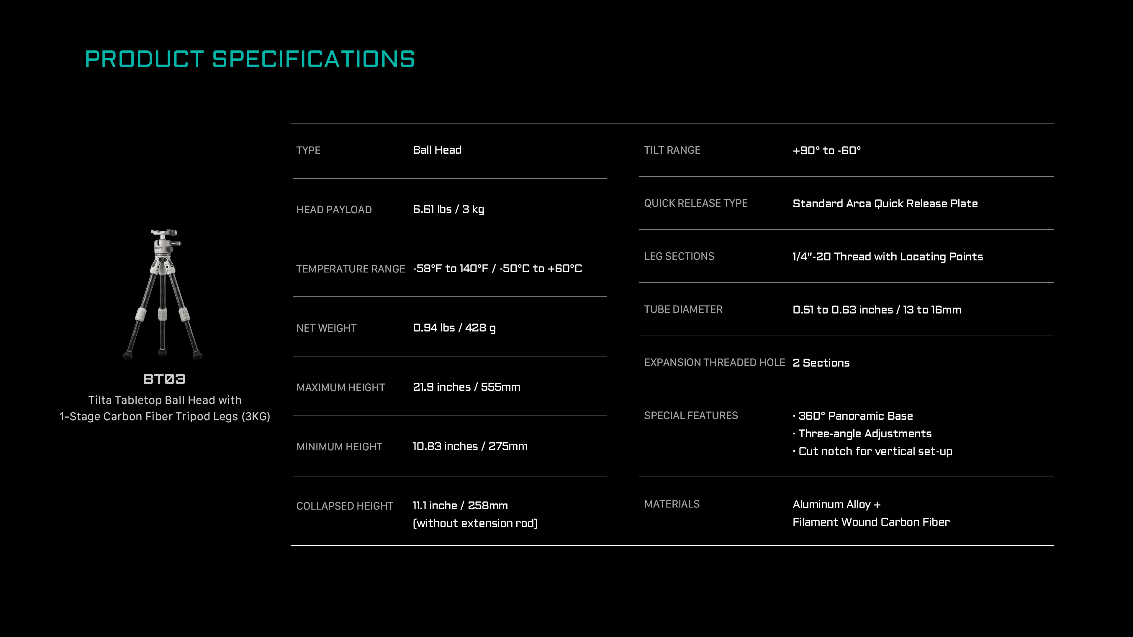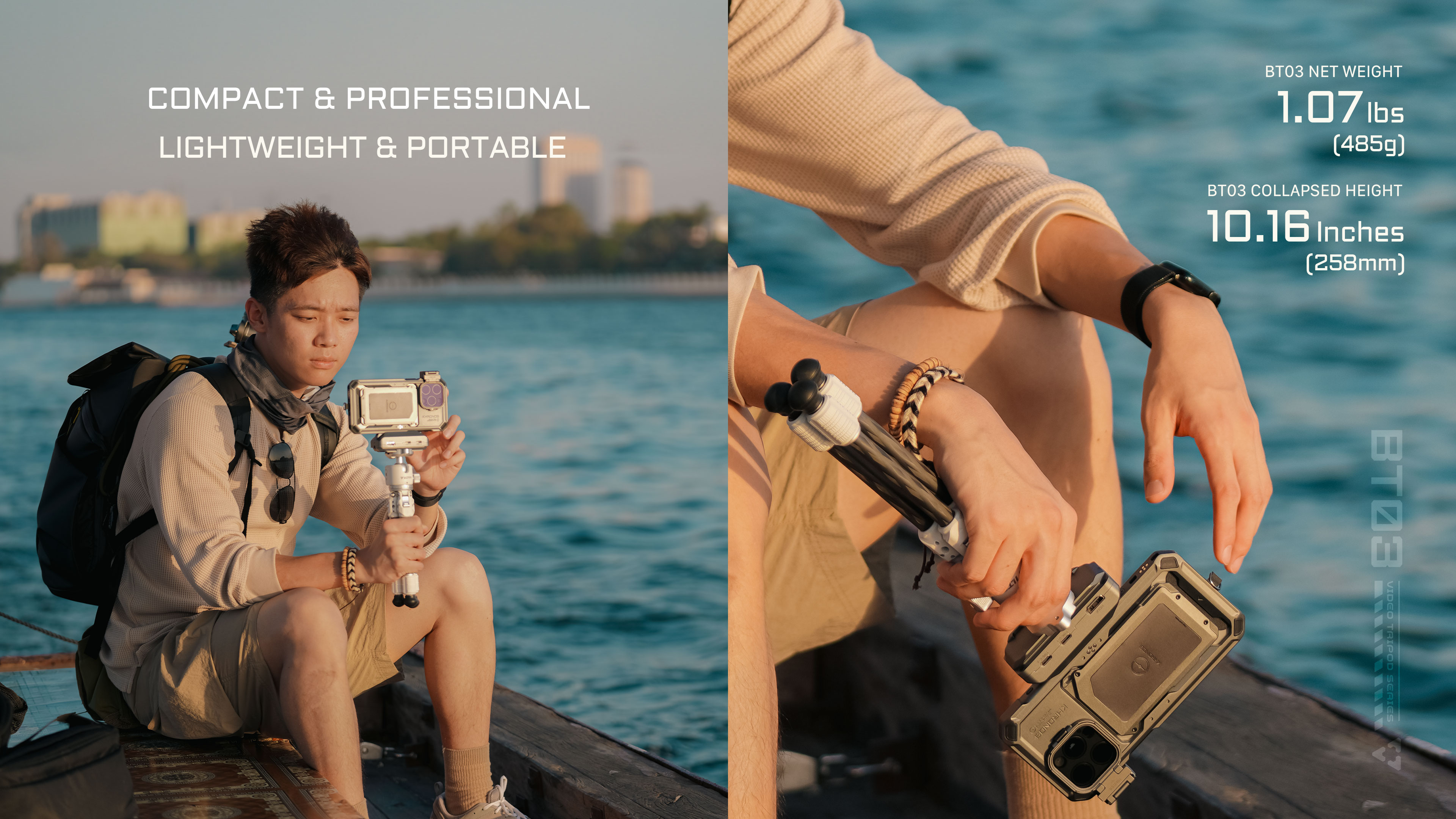 BT03 dolazi opremljen robusnom kuglastom glavom koja podržava do 3 kg i uključuje utor za vertikalno snimanje od 90°, što omogućuje besprijekorne prijelaze između horizontalne, vertikalne i nadzemne konfiguracije.