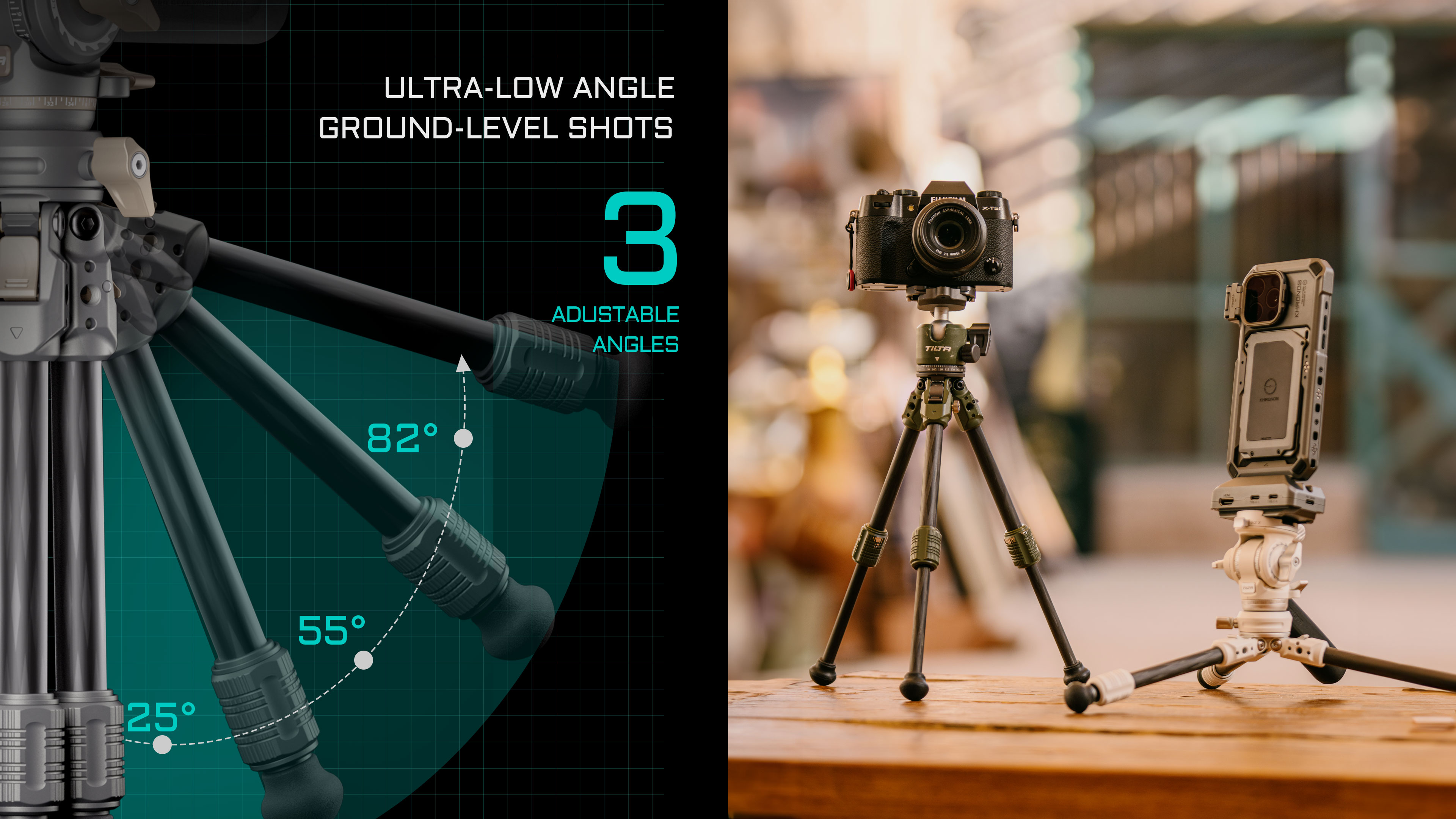 S elegantnim dizajnom bez središnjeg stupa, ovaj stativ izvrsno se snalazi u uskim prostorima i snimkama iz niskog kuta. Mogućnosti snimanja iz ultra niskog kuta stativa poboljšane su s tri podesiva kuta nogu, omogućujući kreativne perspektive iz različitih perspektiva.