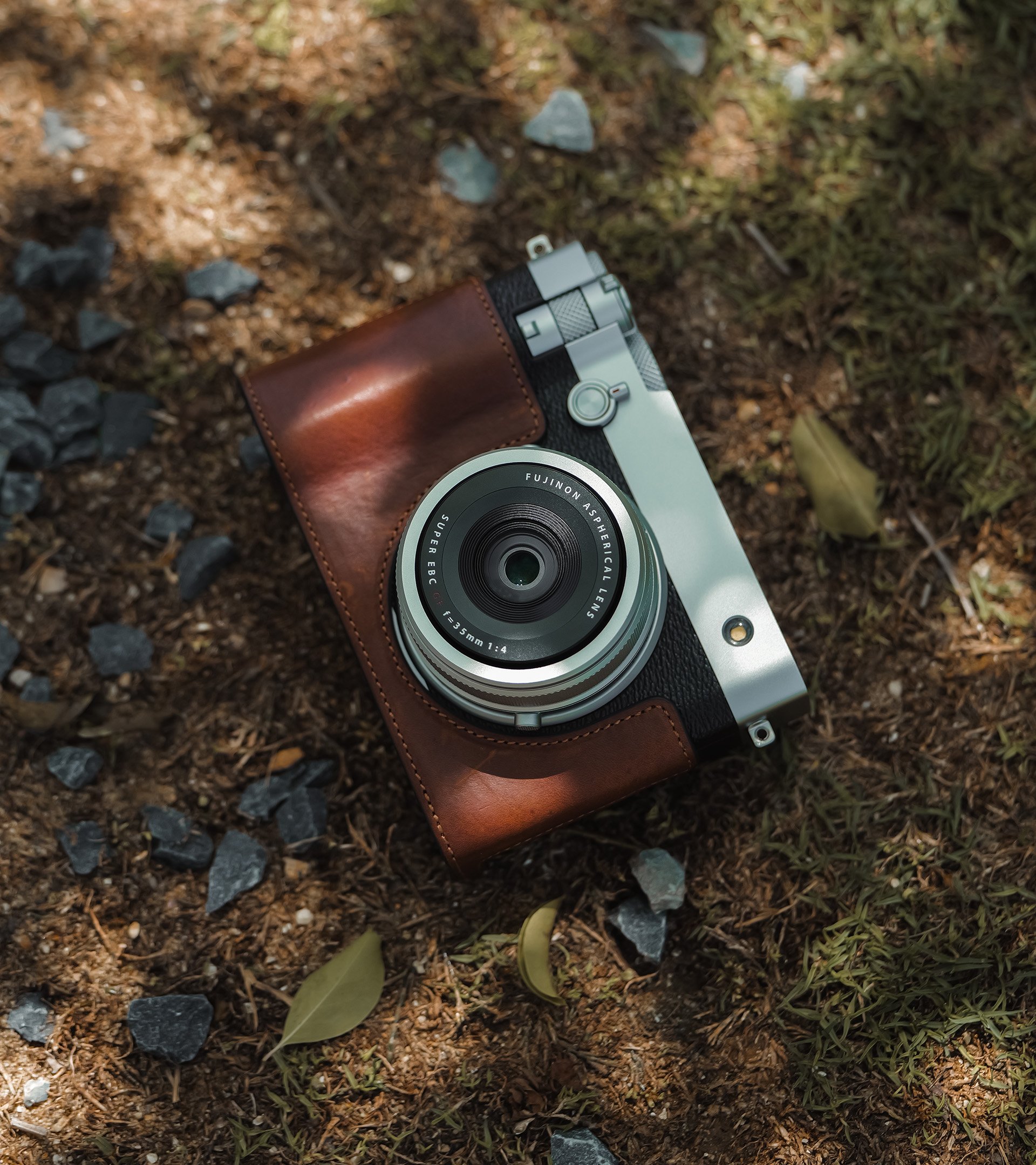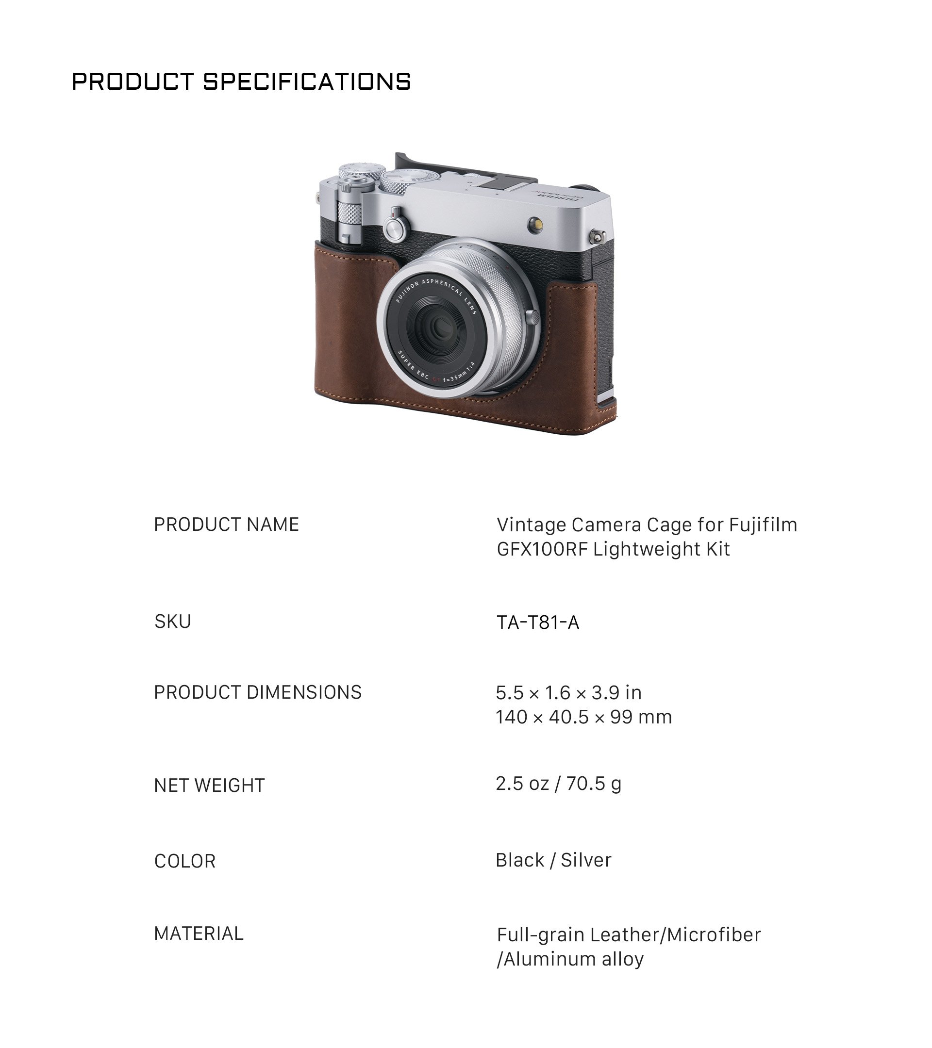 Predstavljamo lagani komplet za vintage kameru za Fujifilm GFX100RF. Ovaj komplet uključuje kožnu torbicu za kameru za Fujifilm GFX100RF, koja se montira pomoću vijka 1/4″-20 i pruža korisnicima ugodniji način rukovanja tijelom fotoaparata putem integrirane ručke.