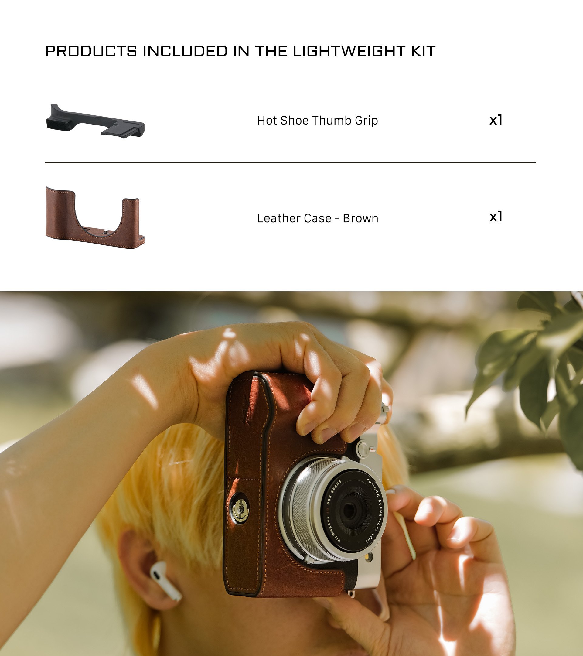 Ovaj komplet uključuje kožnu torbicu za fotoaparat Fujifilm GFX100RF, koja se montira pomoću vijka 1/4″-20 i pruža korisnicima ugodniji način rukovanja tijelom fotoaparata putem integrirane ručke.