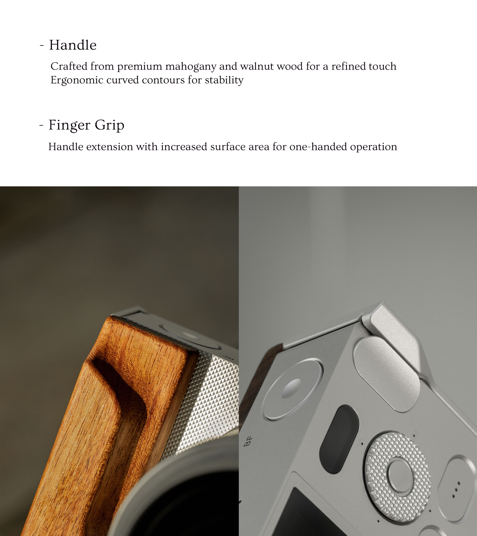 Temelj ovog kompleta je L-nosač s drvenom ručkom izrađenom od oraha. To omogućuje ugodniji način rada i rukovanja fotoaparatom, a istovremeno ostaje kompaktan i jednostavan za putovanja.