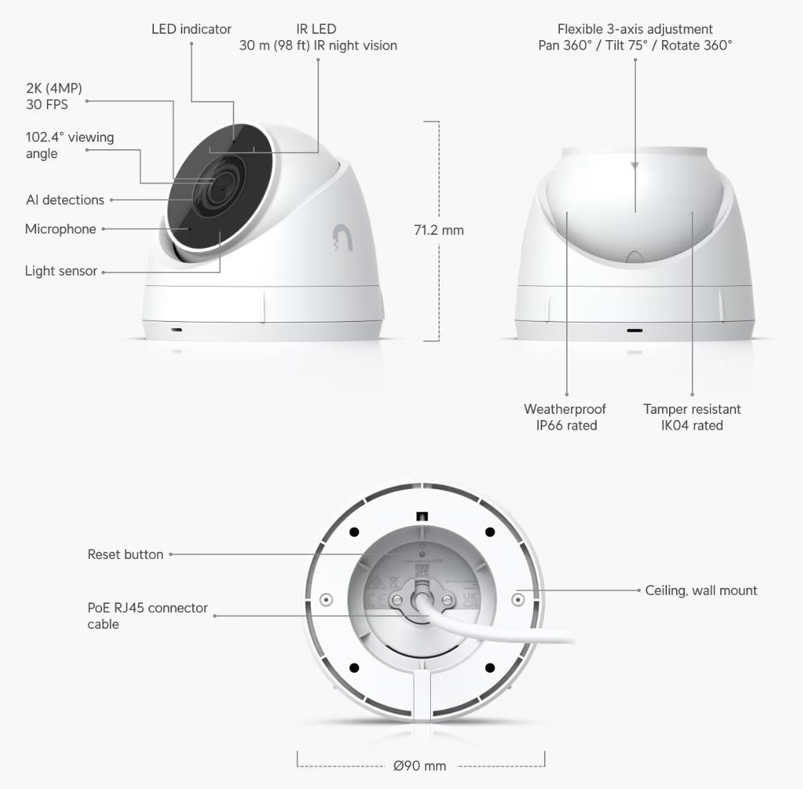 UVC-G5-Turret-Ultra je kamera 5. generacije iz UniFi Video serije. Ima 1/2,4" CMOS senzor rezolucije 4MP (2688 x 1512 px, 16:9) @ 30 FPS. Fiksni objektiv ima kut gledanja od 102,4° horizontalno, 54,9° vertikalno i 120,6° dijagonalno. Kamera je opremljena mikrofonom (može se isključiti) i (1) 10/100Mbps Ethernet priključkom, preko kojeg se kamera napaja pomoću POE 802.3af ili pasivnog POE s ulaznim naponom od 37 - 57 V DC. Za noćni način rada, kamera je opremljena IR osvjetljenjem dometa 30 m. Maksimalna potrošnja je samo 4 W!