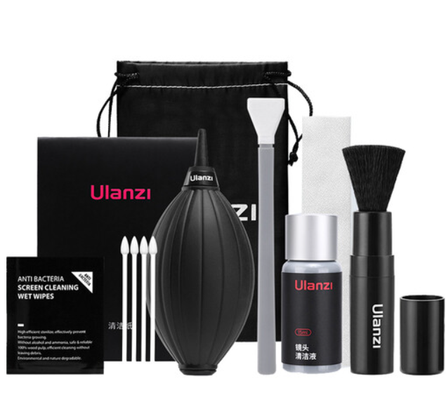 Ulanzi 3173 9-u-1 komplet za čišćenje je neophodan, džepne veličine za fotografe, snimatelje i entuzijaste gadgeta koji se bore s prašinom, otiscima prstiju i prljavštinom na objektivima, senzorima i zaslonima. Smješten u vodootpornoj najlonskoj vrećici s vezicom (120x80x40 mm), ovaj komplet od 98 g koristi devet preciznih alata: antistatičku tekućinu s pumpicom od 20 ml koja briše tragove bez oštećenja AR premaza; silikonsku raketnu puhaljku od 60 mm koja isporučuje mlazove od 150 ml pri brzini od 150 km/h za uklanjanje tvrdokornih čestica, uvlačivu četku od karbonskih vlakana od 12 mm za osjetljive pukotine; četiri pjenasta štapića bez dlačica (2x 2 mm, 2x 4 mm) za ciljano čišćenje, špatulu od mikrovlakana od 24 mm s drškom od 120 mm za glatke pokrete po APS-C/full-frame senzoru, dvije zatvorene antistatičke vlažne maramice bez alkohola od 6x6 cm za brzo čišćenje zaslona; krpa od mikrovlakana 10x10 cm 300 GSM za opće brisanje i svilena krpa 15x15 cm za ultra fino poliranje.