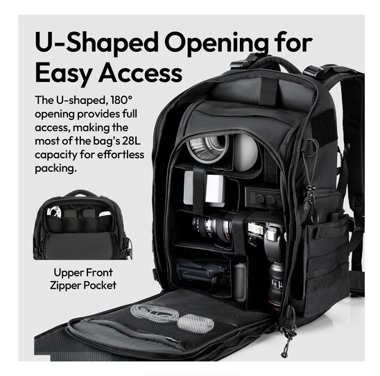 Taktika ruksak nudi obilje prostora za pohranu, uključujući gornji prednji džep za brzi pristup i pretince za laptop od 15,7" i tablet od 11". Glavni odjeljak otvara se na dvostranu preklopnu konstrukciju za jednostavan pristup foto-kubu, dok vam bočni panel za brzo vađenje omogućuje da zgrabite fotoaparat u pokretu. Prednja i bočna MOLLE traka omogućuju vam pričvršćivanje dodatne opreme, a bočni džep može pohraniti bocu s vodom ili putni stativ. Ruksak također uključuje vanjske remene za pričvršćivanje glomaznih predmeta poput jakni ili vreća za spavanje. Bilo da idete na fotografiranje ili avanturu, ovaj ruksak od 28 L dizajniran je da pruži udobnost, organizaciju i zaštitu za vašu opremu.