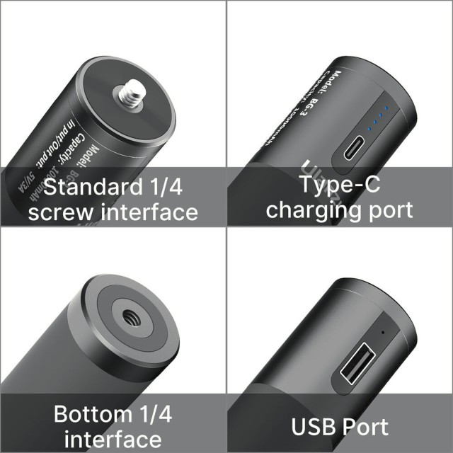 Na vrhu BG-3 nalazi se montažni vijak 1/4"-20, koji vam omogućuje pričvršćivanje akcijskih kamera, kompaktnih bezzrcalnih fotoaparata, držača za telefone, LED svjetala, mikrofona i drugih dodataka. Za statično snimanje, na dnu se može montirati mini stativ na navoj 1/4"-20, pretvarajući ručku u stabilan stativ za timelapse fotografiju, vloganje ili snimanje na stolu. LED indikatori prikazuju status baterije i punjenja, dok dvostruki USB priključci omogućuju istovremeno punjenje i korištenje uređaja. Lagana, svestrana i kompaktna, BG-3 je neizostavan dodatak za mobilne kreatore sadržaja.
