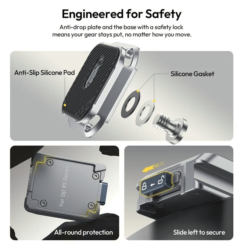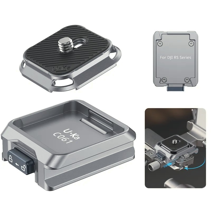 Ulanzi C061 Uka komplet za brzo otpuštanje za DJI RS seriju osmišljen je za pojednostavljenje radnih procesa montaže kamere za filmaše i kreatore sadržaja koji koriste DJI RS stabilizatore. Dizajniran za kompatibilnost s DJI RS 2, RS 3, RS 3 Pro, RS 4, RS 4 Pro i RS 4 Mini, ovaj svestrani sustav za brzo otpuštanje omogućuje vam montažu i demontažu kamere u sekundi uz održavanje maksimalne stabilnosti.