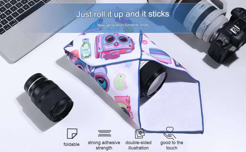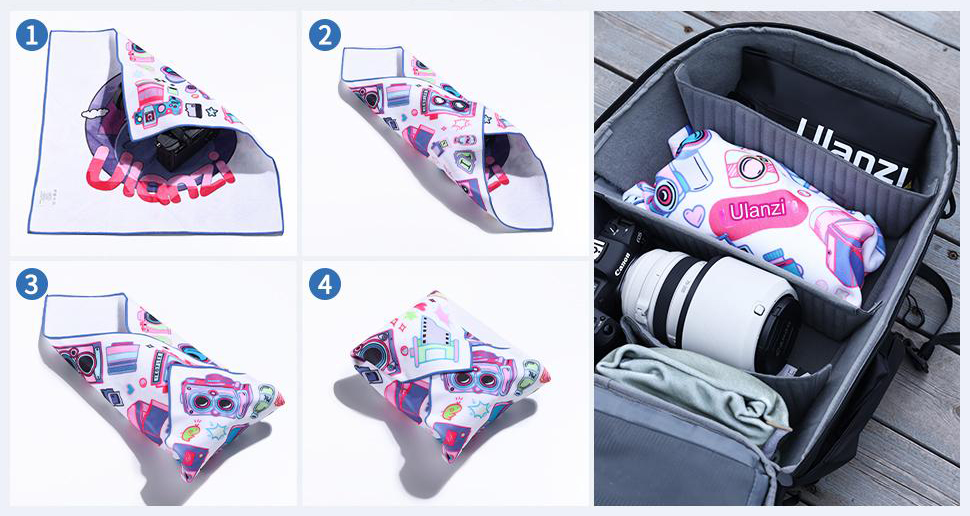 Krpa za kameru koristi posebnu strukturu vlakana koja će se zalijepiti za površinu i stražnju stranu krpe za kameru kada se složi. Srednja debljina pruža dodatnu zaštitu od udaraca i trenja. Podstava je izrađena od brušene tkanine koja je ugodna na dodir i jednostavna za pohranu predmeta.