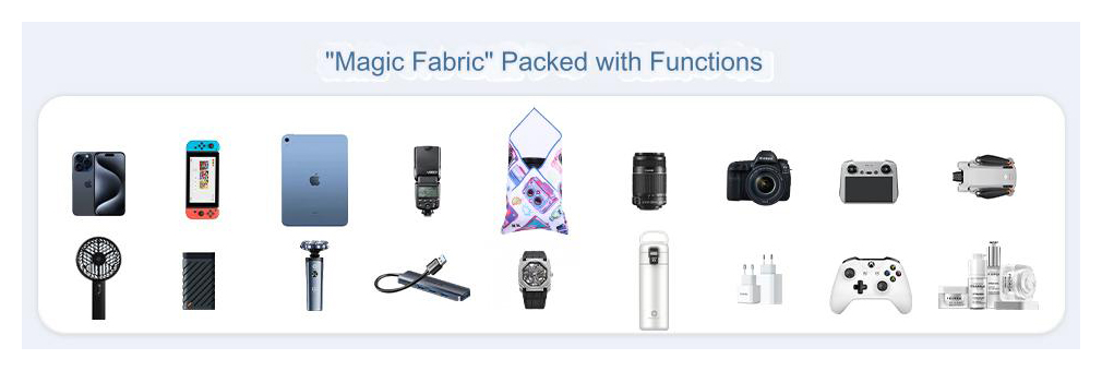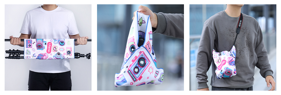 Kvadratna podstava dimenzija je 450 x 450 mm (17,7 x 17,7 inča) i zaštitna je tkanina koja se lako može omotati u bilo koji oblik bez potrebe za vezanjem. Omotajte svoje ručkove, kozmetiku, plastične boce, sklopive kišobrane kako god želite digitalnim uređajima poput fotoaparata, objektiva, filtera, ručnih stabilizatora, tableta itd.