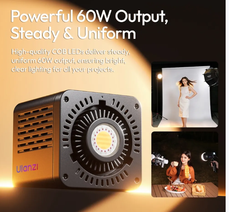 Ulanzi C60RGB 60W RGB COB LED video svjetlo je kompaktno osvjetljenje profesionalne kvalitete za kreatore. S punim RGB spektrom i podesivom bijelom/toplom svjetlošću, ugrađenom baterijom od 3300 mAh, 20 načina simulacije scena i kompatibilnošću s mini Bowens priključkom, pruža snažno i svestrano osvjetljenje za portrete, vlogove, prijenose uživo i filmski sadržaj.