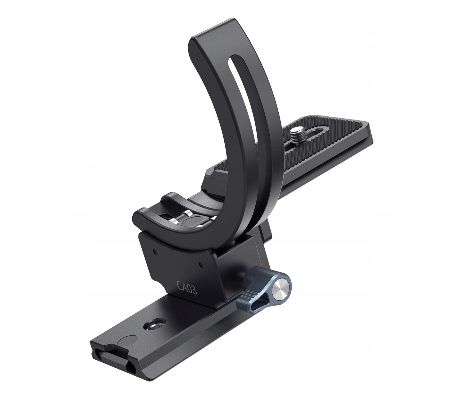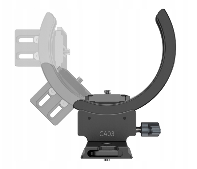 Visina podesive platforme omogućuje precizno podešavanje za različite dizajne leća, dok dizajn polukružnog prstena omogućuje montažu bez skidanja leće s fotoaparata. Izrađen od aluminija i čelika otpornih na ogrebotine i koroziju, CA03 podupire leće težine do 5 kg, a istovremeno zadržava laganu i prenosivu konstrukciju.