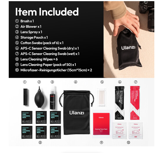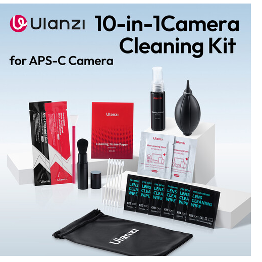 Ulanzi CO72 10-u-1 komplet za čišćenje sveobuhvatno je rješenje za čišćenje dizajnirano za APS-C kamere i objektive. Sadrži mokre i suhe maramice za čišćenje APS-C senzora, puhalo zraka, četkicu, sprej za čišćenje leća, pamučne štapiće, maramice za leće i mikrovlaknene krpice. Sav pribor dolazi u praktičnoj vrećici za pohranu, što omogućuje sigurno i učinkovito čišćenje vaše fotoopreme.